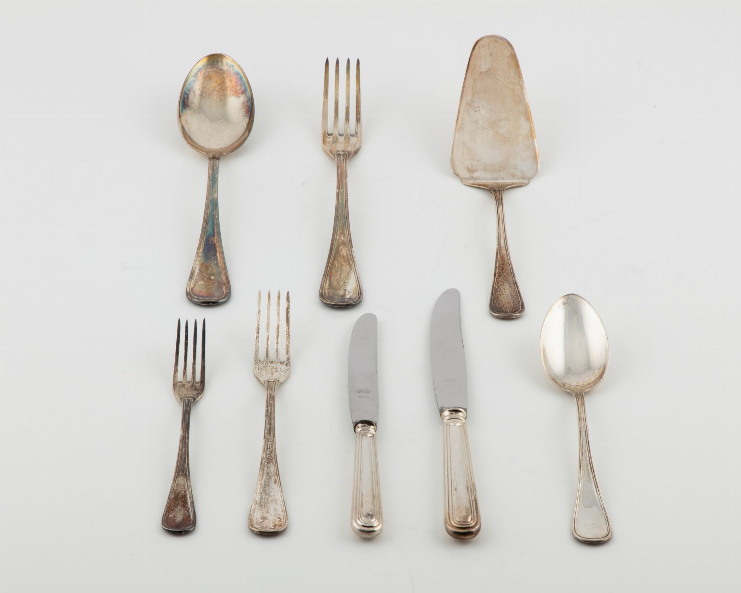 Italia, secolo XX composto da 63 pezzi: 12 cucchiai, 12 forchette, 12 coltelli, 12 forchette frutta, 12 coltelli frutta, e 3 serviti.