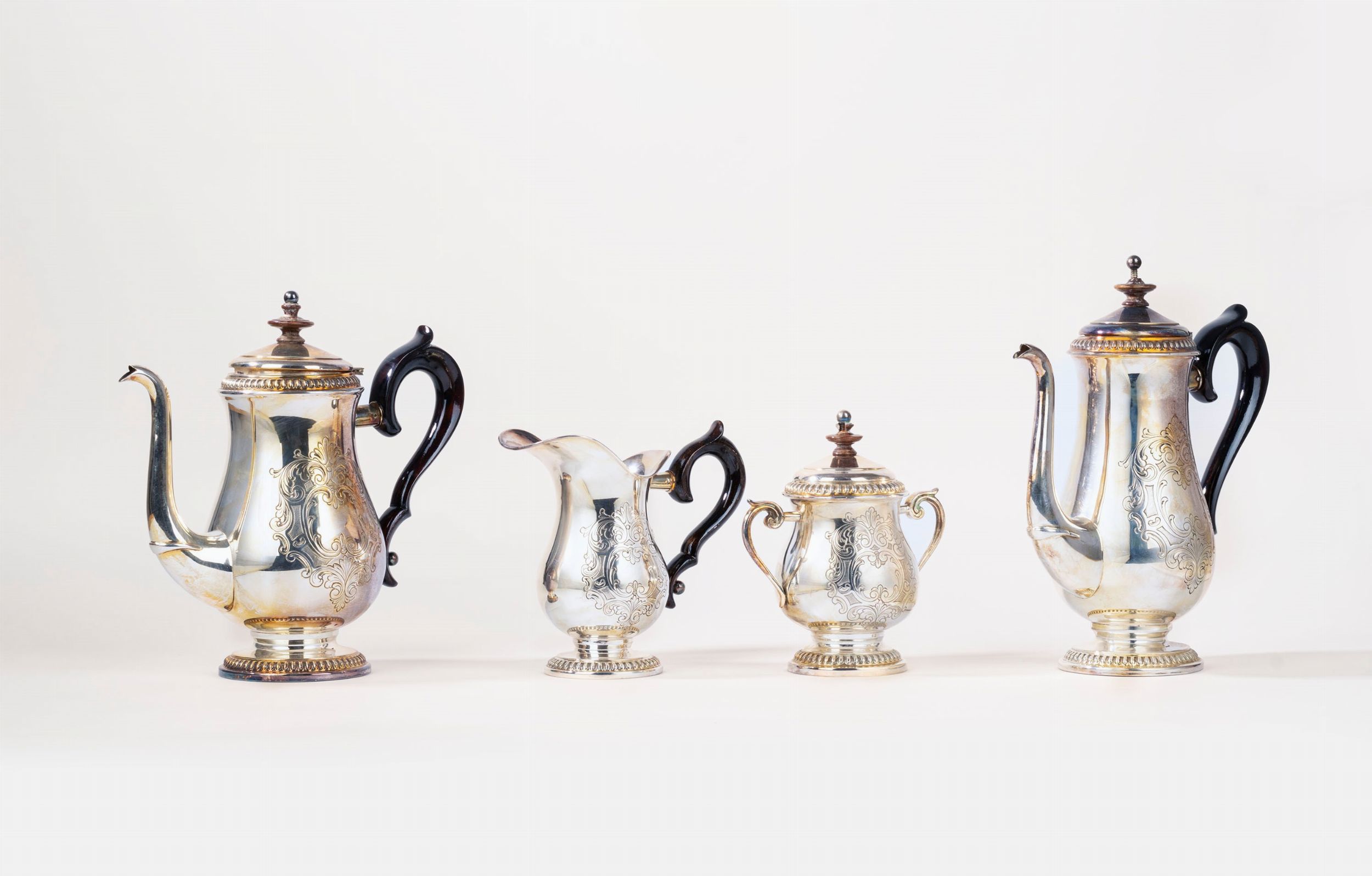 Italia, secolo XX composto da zuccheriera, lattiera, caffettiera e teiera con decori incisi e manici in legno.