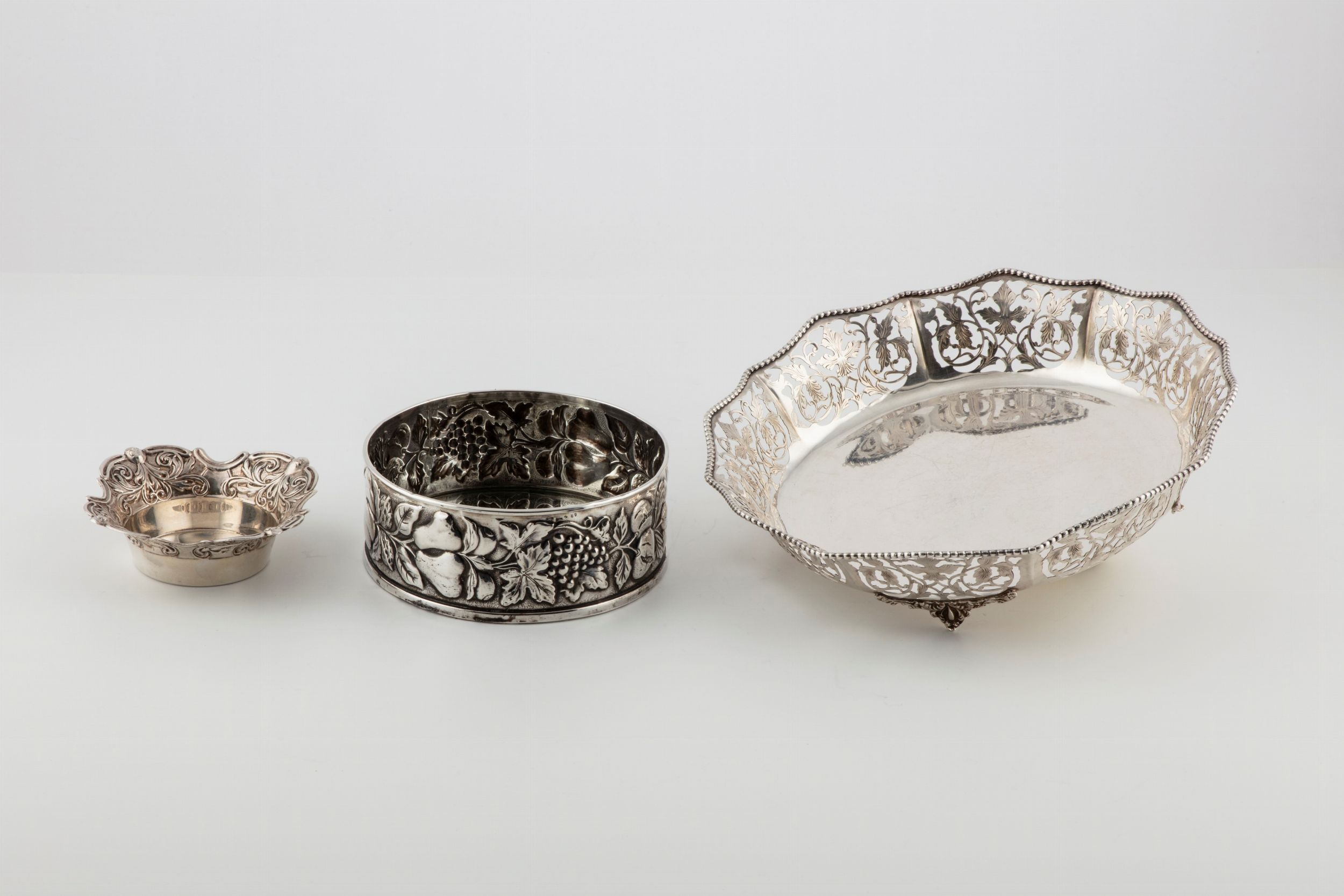 Italia, secolo XX una traforata con motivi floreali, bordo a perline e piedini floreali (l cm 28,00), una polilobata e sbalzata a motivi floreali (l cm 13,00) e una circolare, sbalzata con melograni, mele, pere e viticci, con vetro interno e supporto in legno alla base (l cm 16,00).