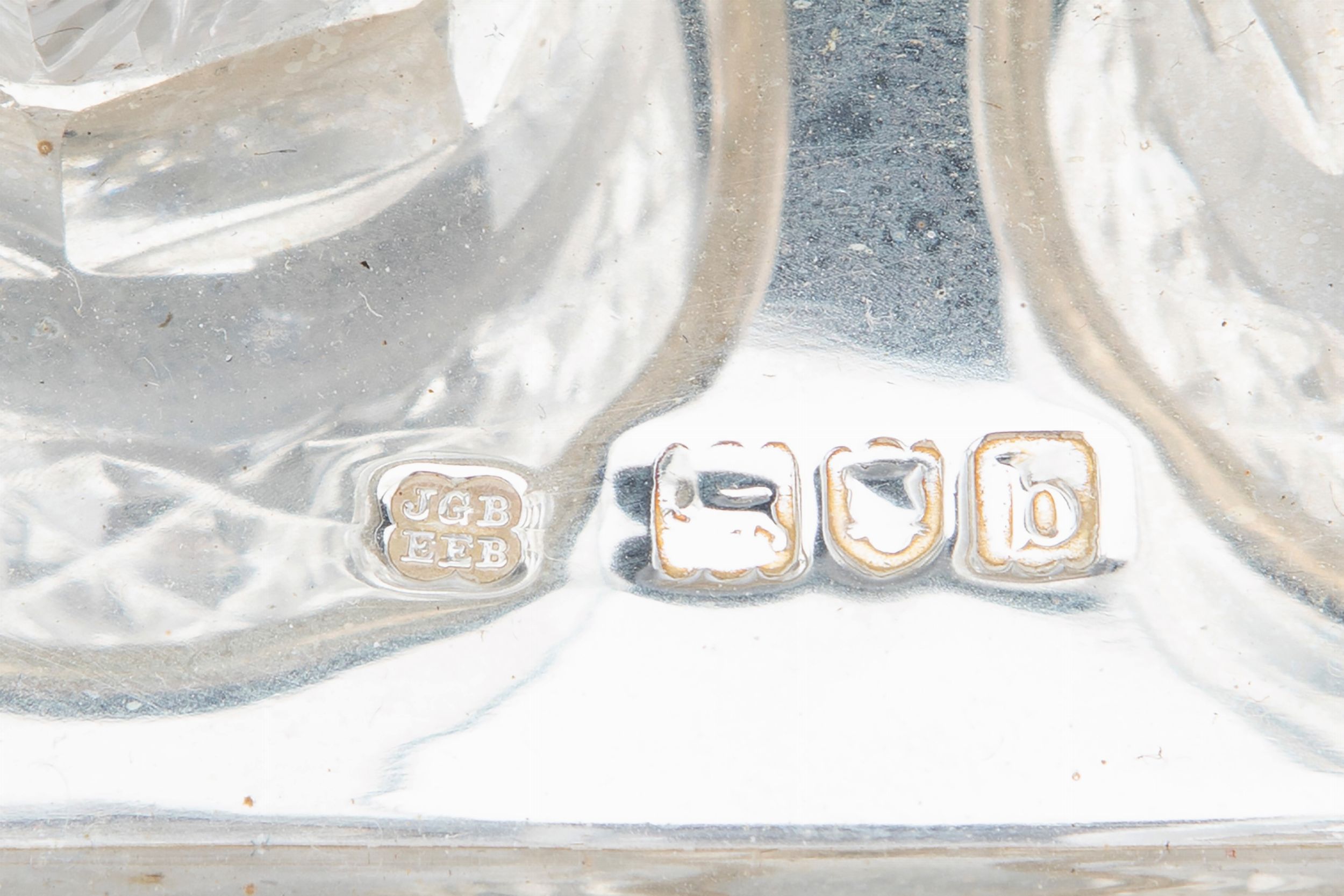 Chester 1898 e Londra 1897 argentieri BM (non identificato) e JGB-EEB (non identificato), vassoio di forma rettangolare a due manici (Londra, cm 50,00x13,50), fondo in legno, poggiante su quattro piedini a bottone, due scomparti con bottiglie in cristallo, tappi e presa a putto in argento (Chester) e otto scomparti con bicchierini in cristallo molato.