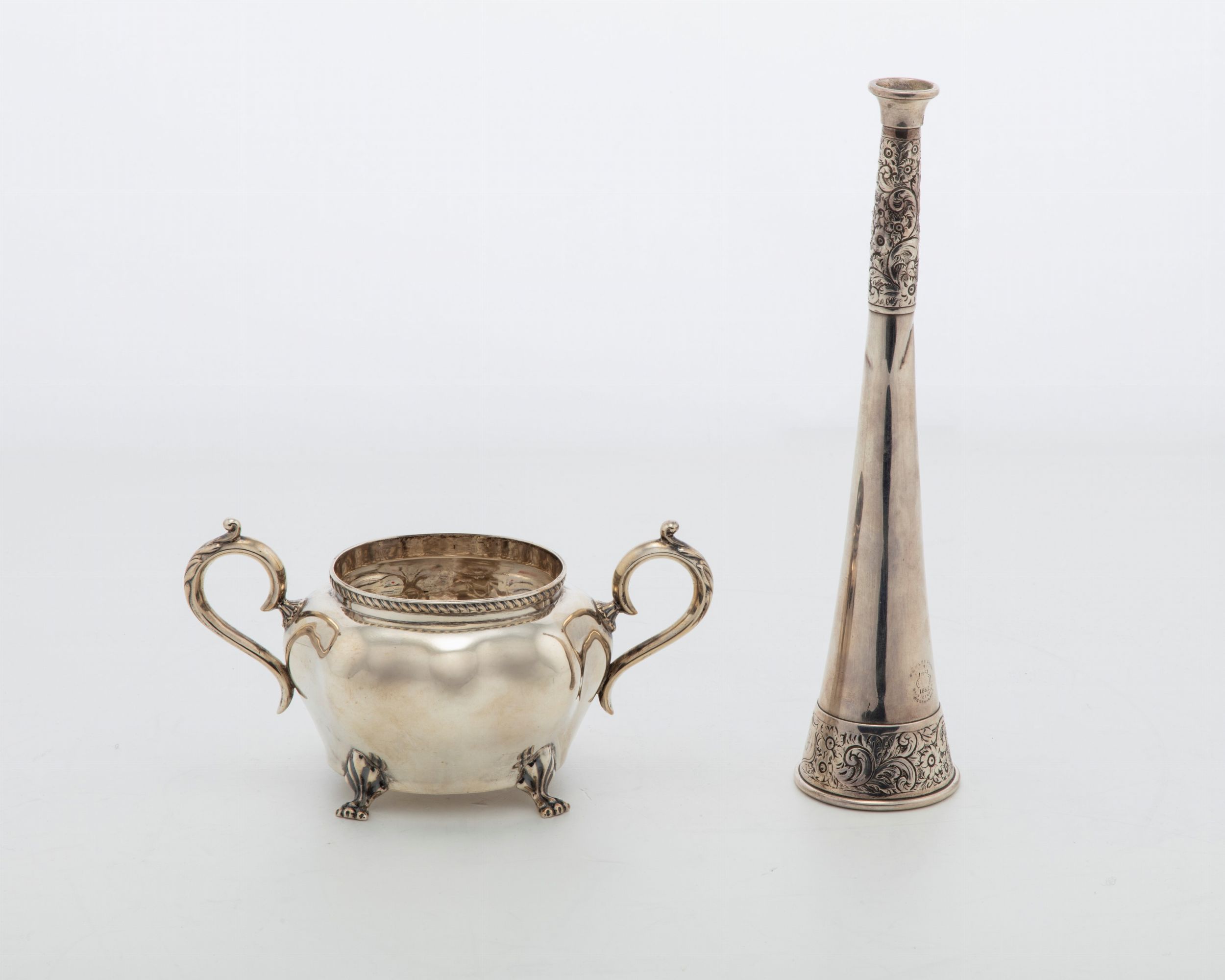 Inghilterra, secolo XIX/XX la zuccheriera, argentiere C.H (Charles Horner?), Birmingham 1901, biansata con piedini ferini e bordo cordonato (l cm 17,00), la trombetta argentiere AK (Aaron Katz?), Londra 1893, a fasce incise con decoro floreali (h cm 23,00) (ammaccature).