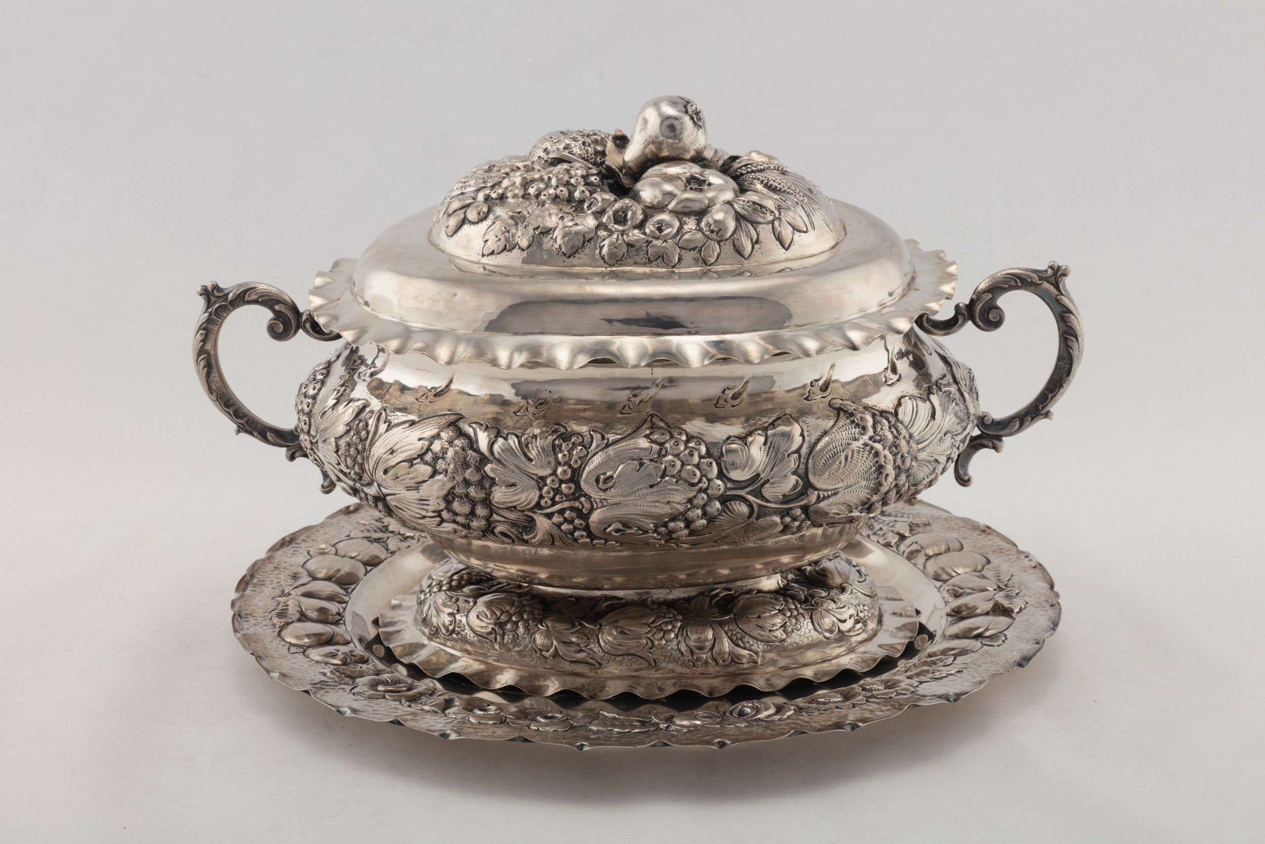 Hanau, fine secolo XIX Argentiere R.C (J.D. Schleissner & Sohne) fusi, sbalzati e cesellati con motivi a festoni e frutta; la zuppiera (h cm 23,00x37,00x p 22,50), il piatto (d cm 34,00), difetti.