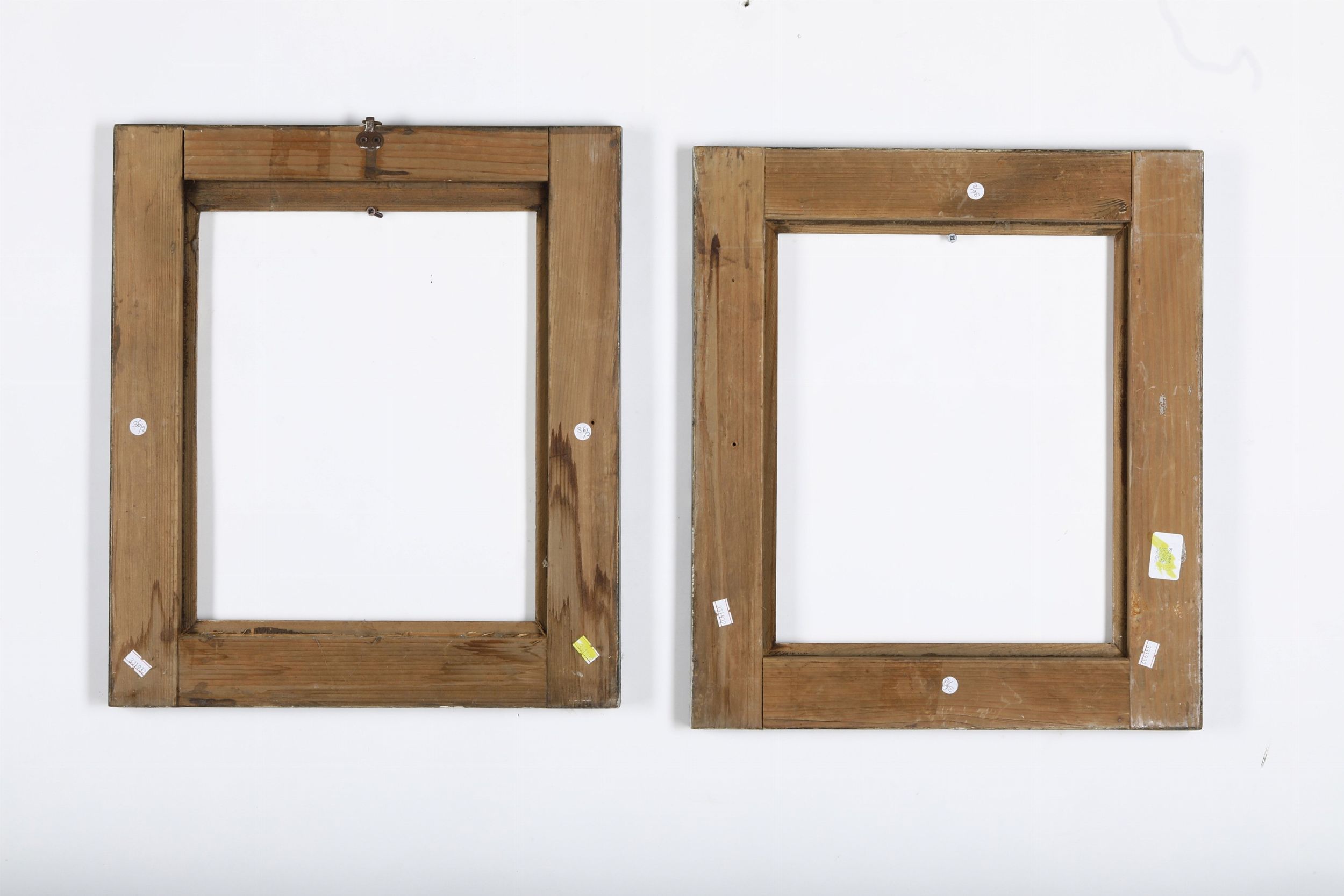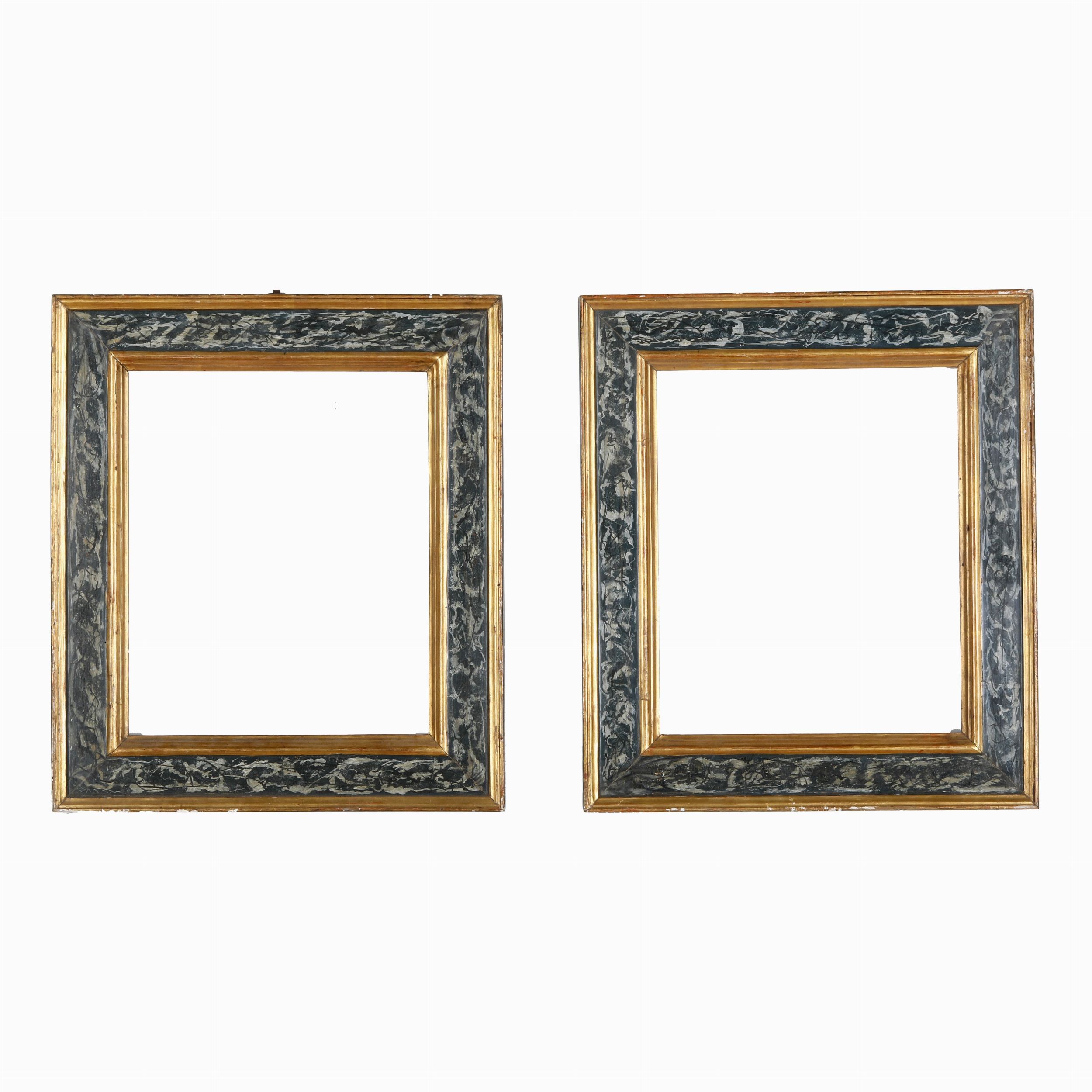 Coppia di cornici a cassetta in legno marmorizzato azzurro e dorato. Marche