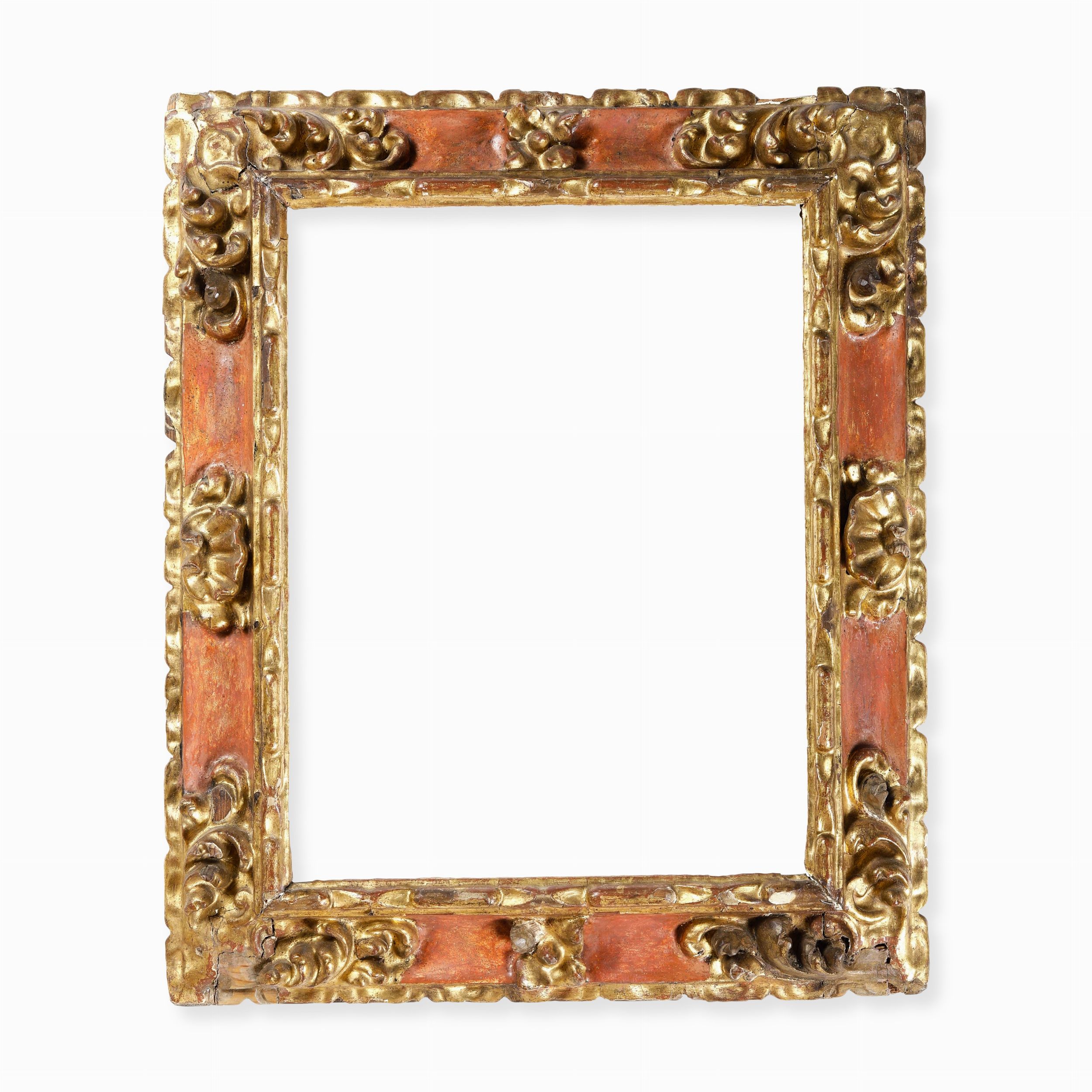 Cornice in legno intagliato dorato e dipinto. Spagna XVII secolo
