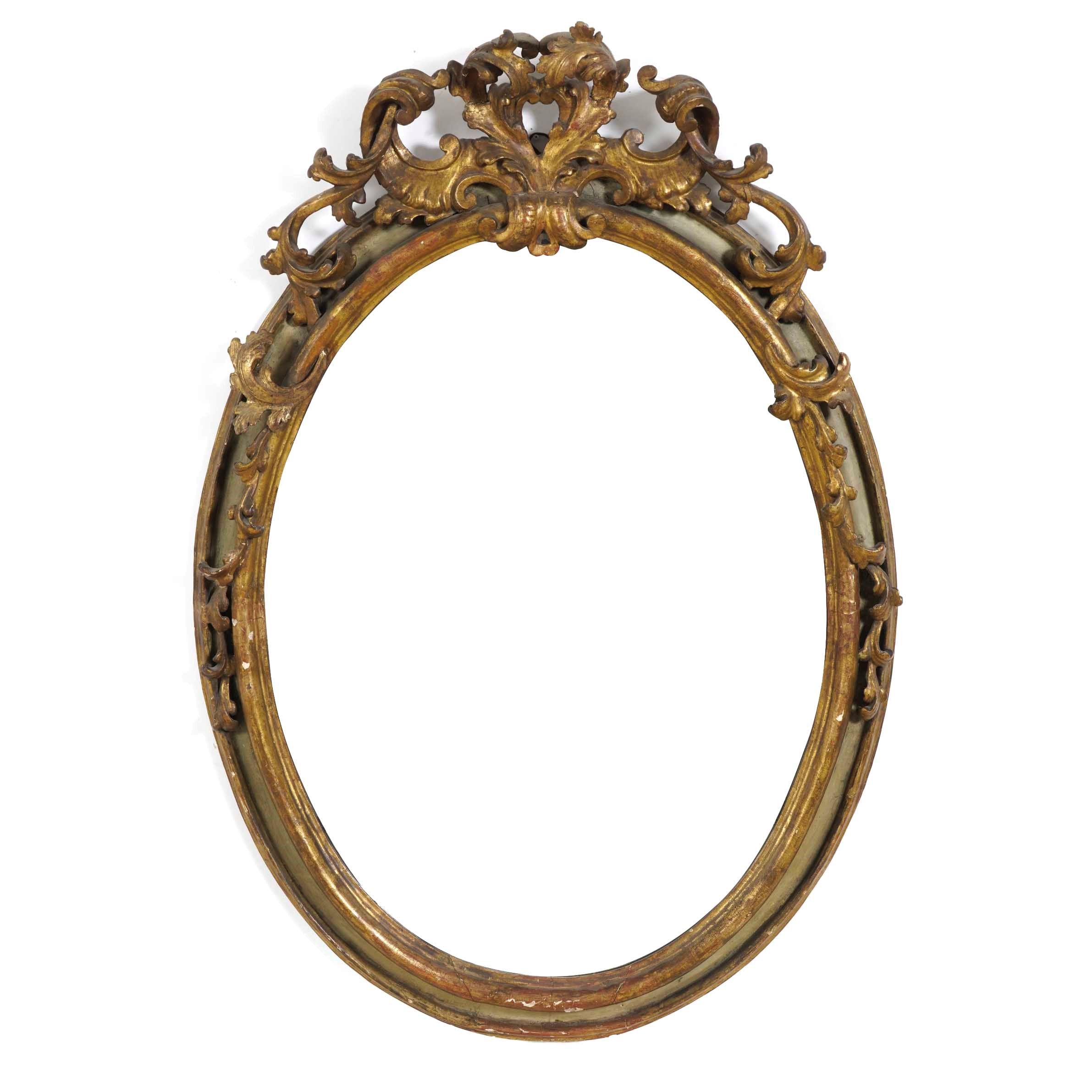 Cornice ovale in legno intagliato, laccato e dorato. XVIII-XIX secolo