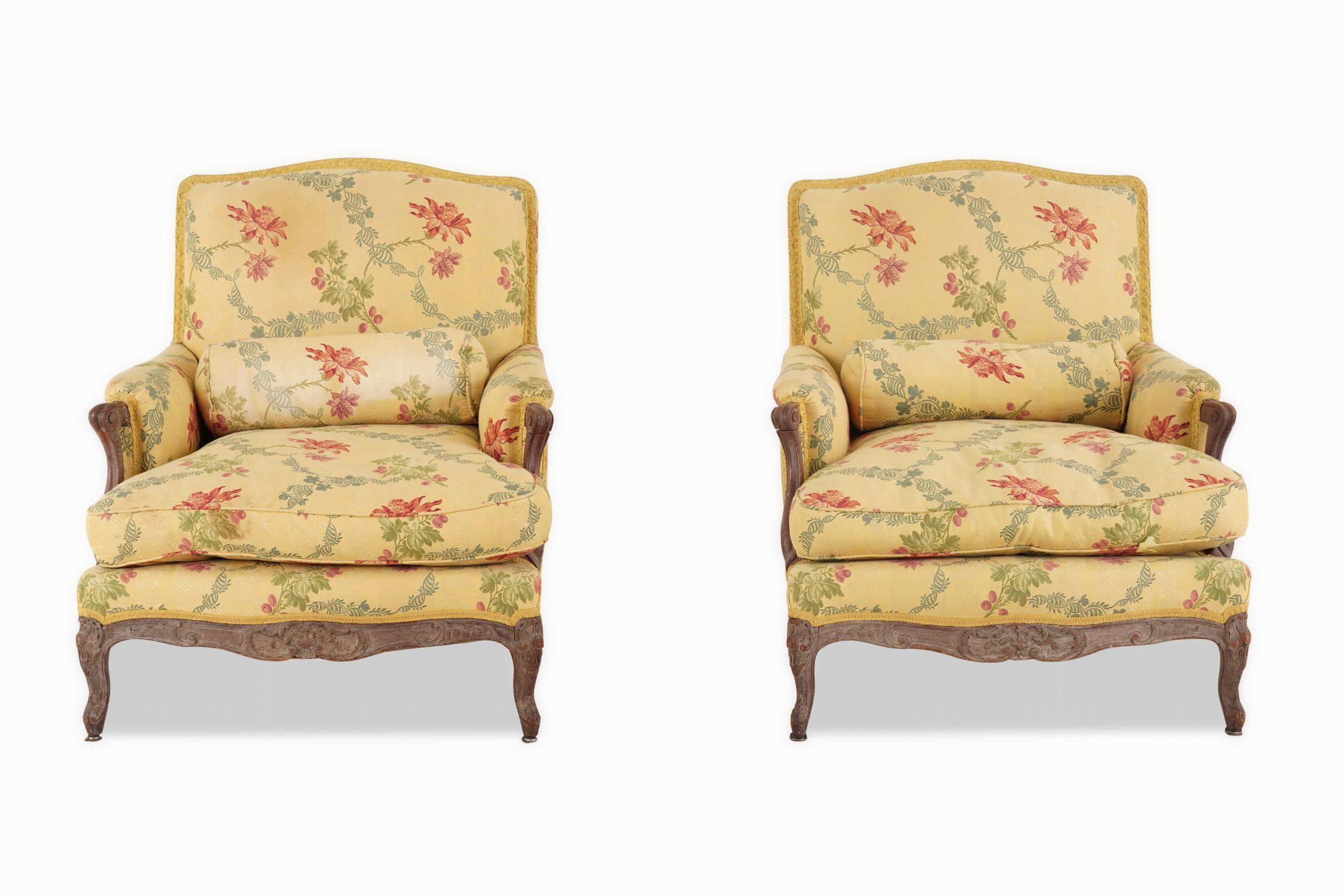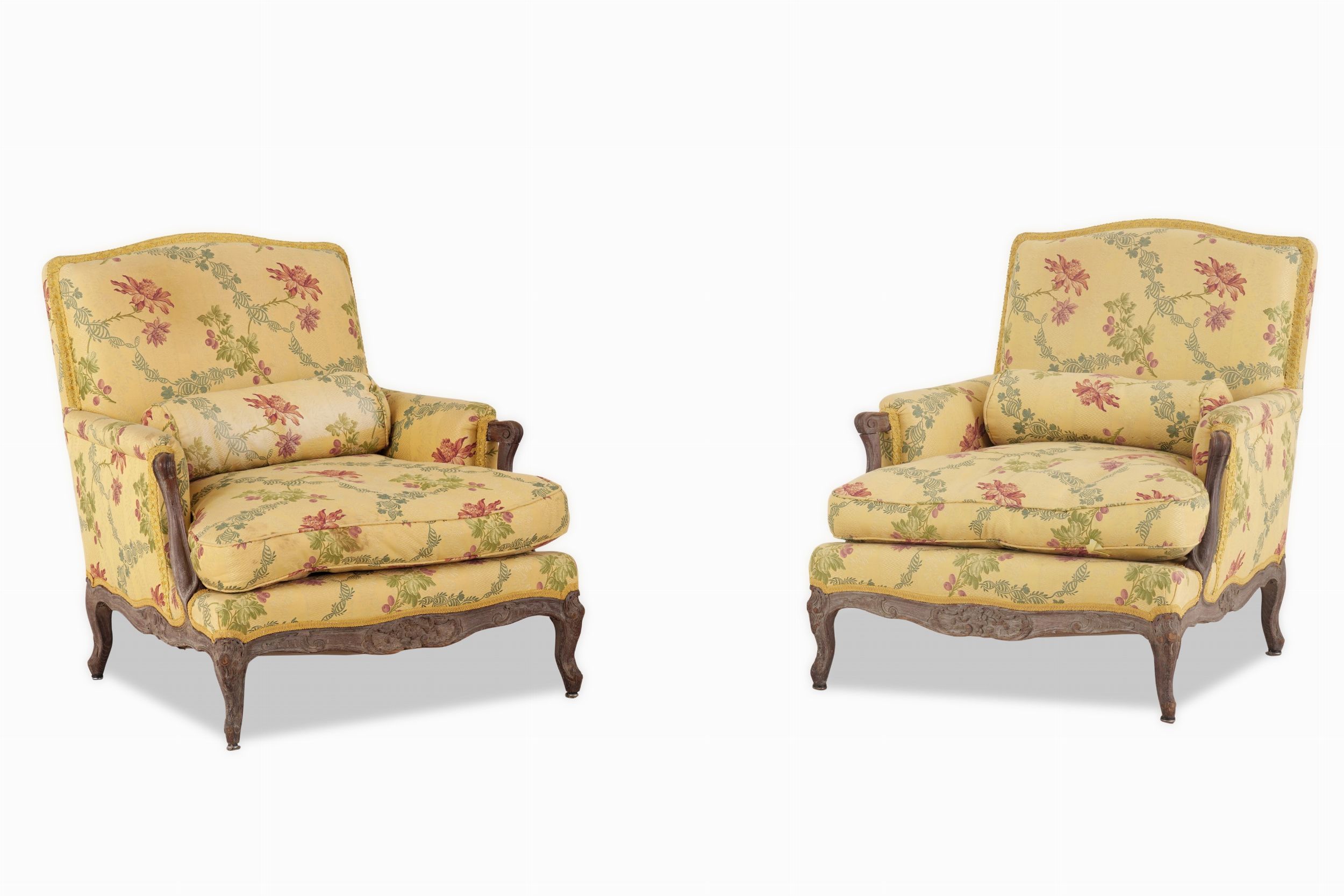 Coppia di bergères in legno intagliato, Francia, in stile settecentesco