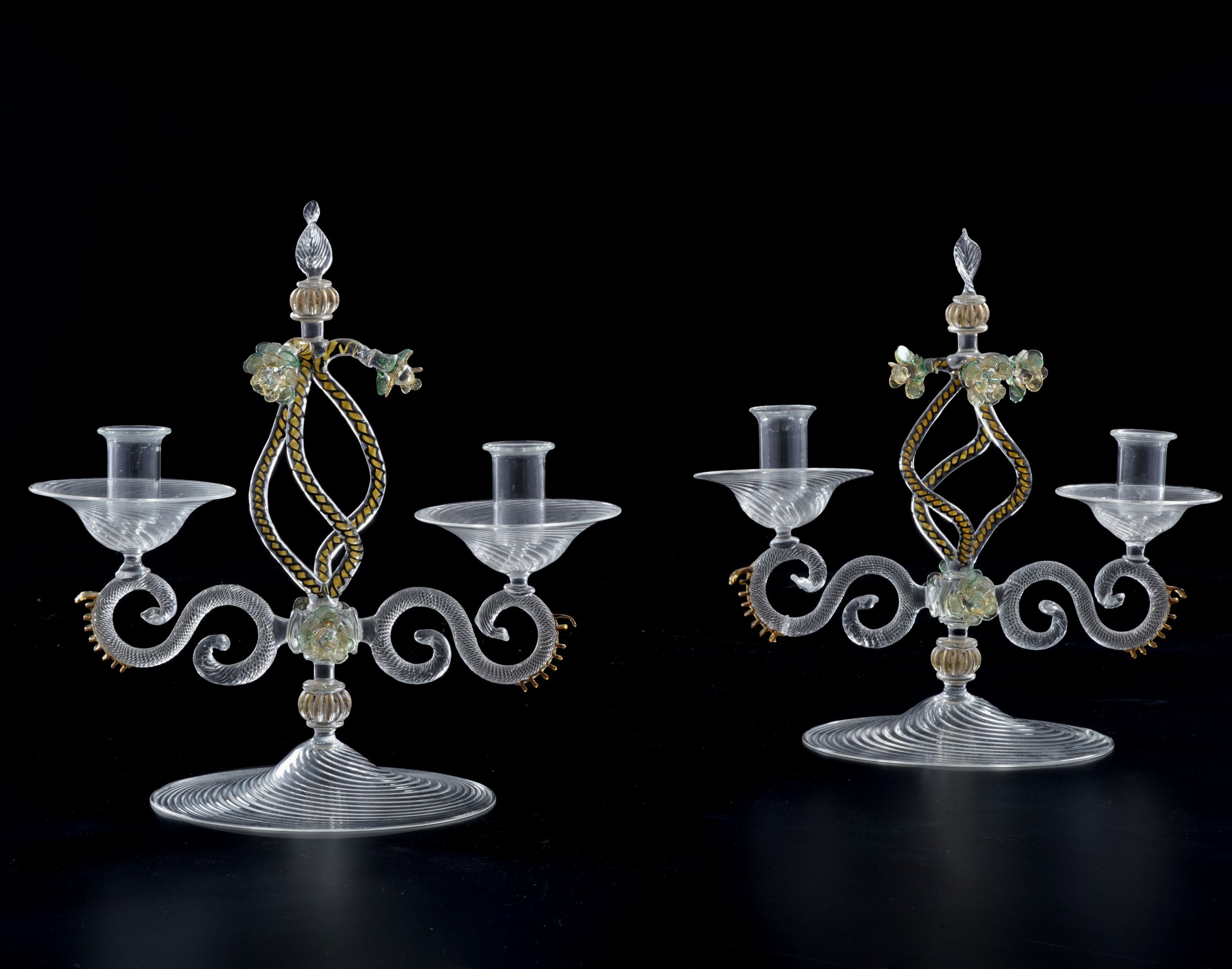 Coppia di candelieri in vetro. Murano, XX secolo