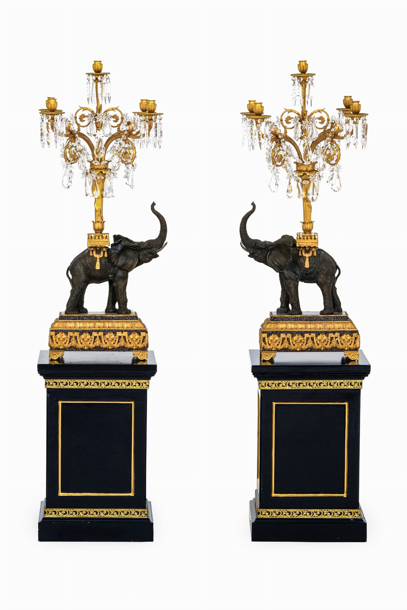 Coppia di grandi candelabri in bronzo patinato e dorato a guisa di elefanti. XX [..]