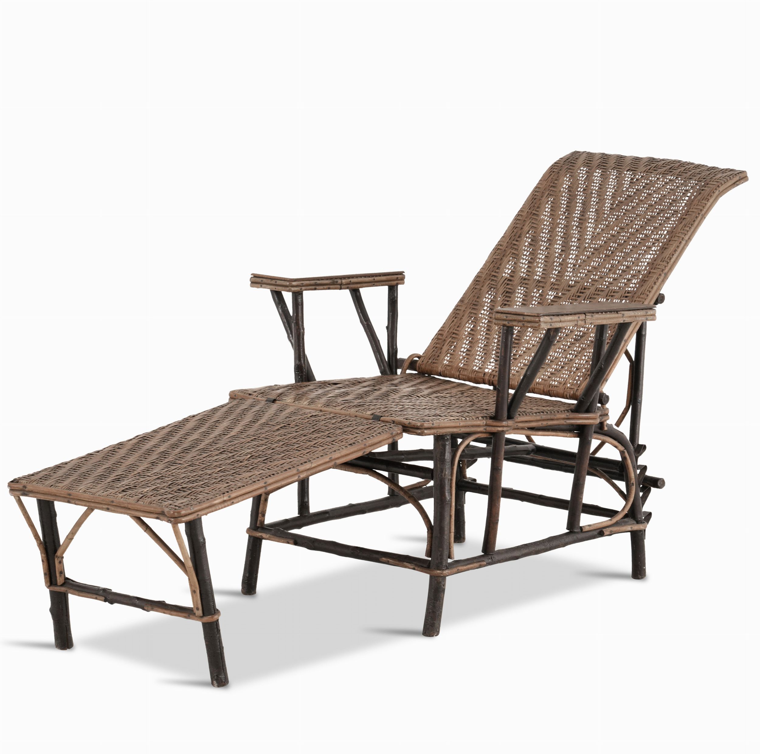 Poltrona con poggiapiedi estraibile in legno e rattan, XX secolo