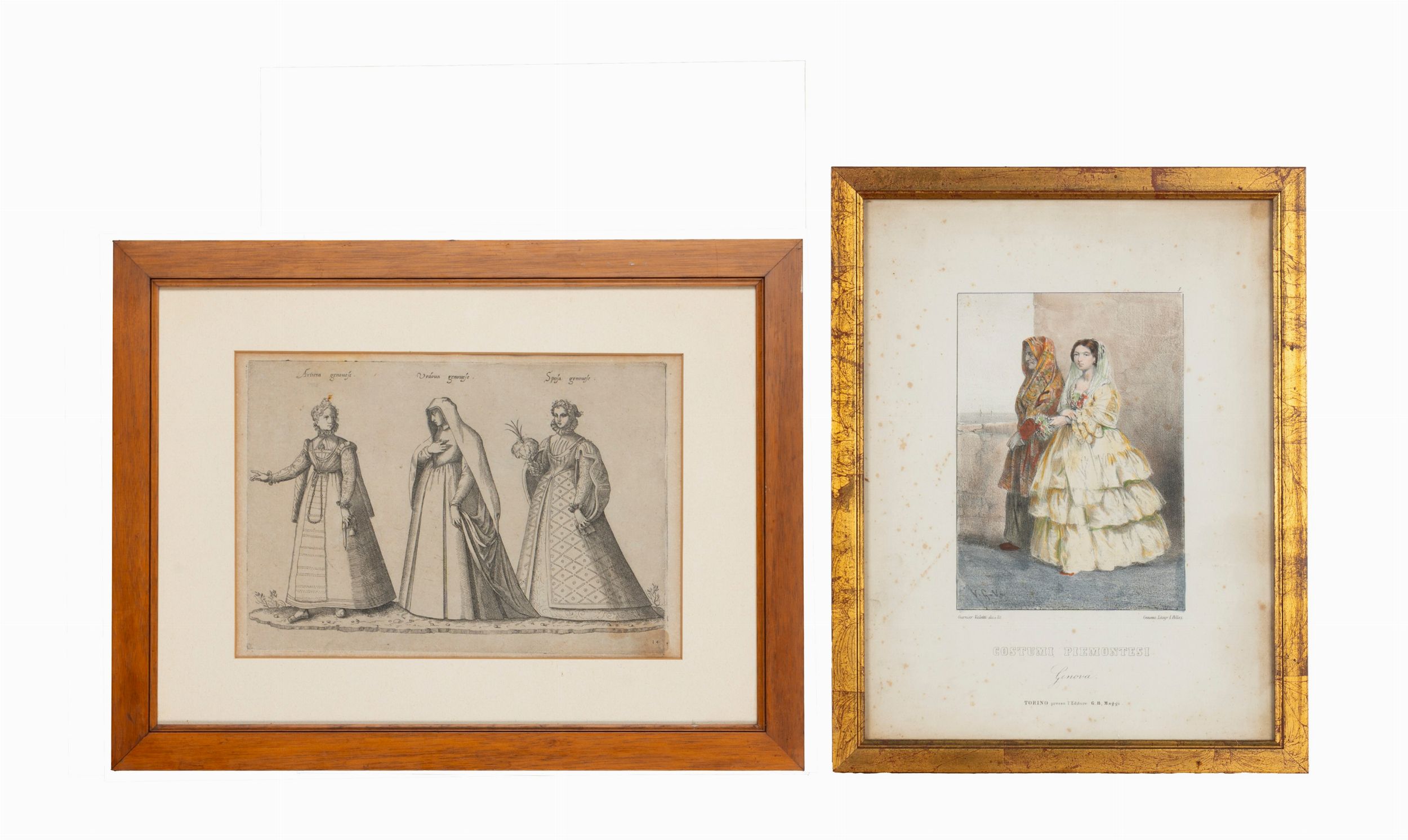 1550 Lotto comprendente un'elegante raffigurazione di tre donne genovesi in abiti da cerimonia, sec XVI; seguono altre stampe raffiguranti personaggi genovesi in abiti tipici.