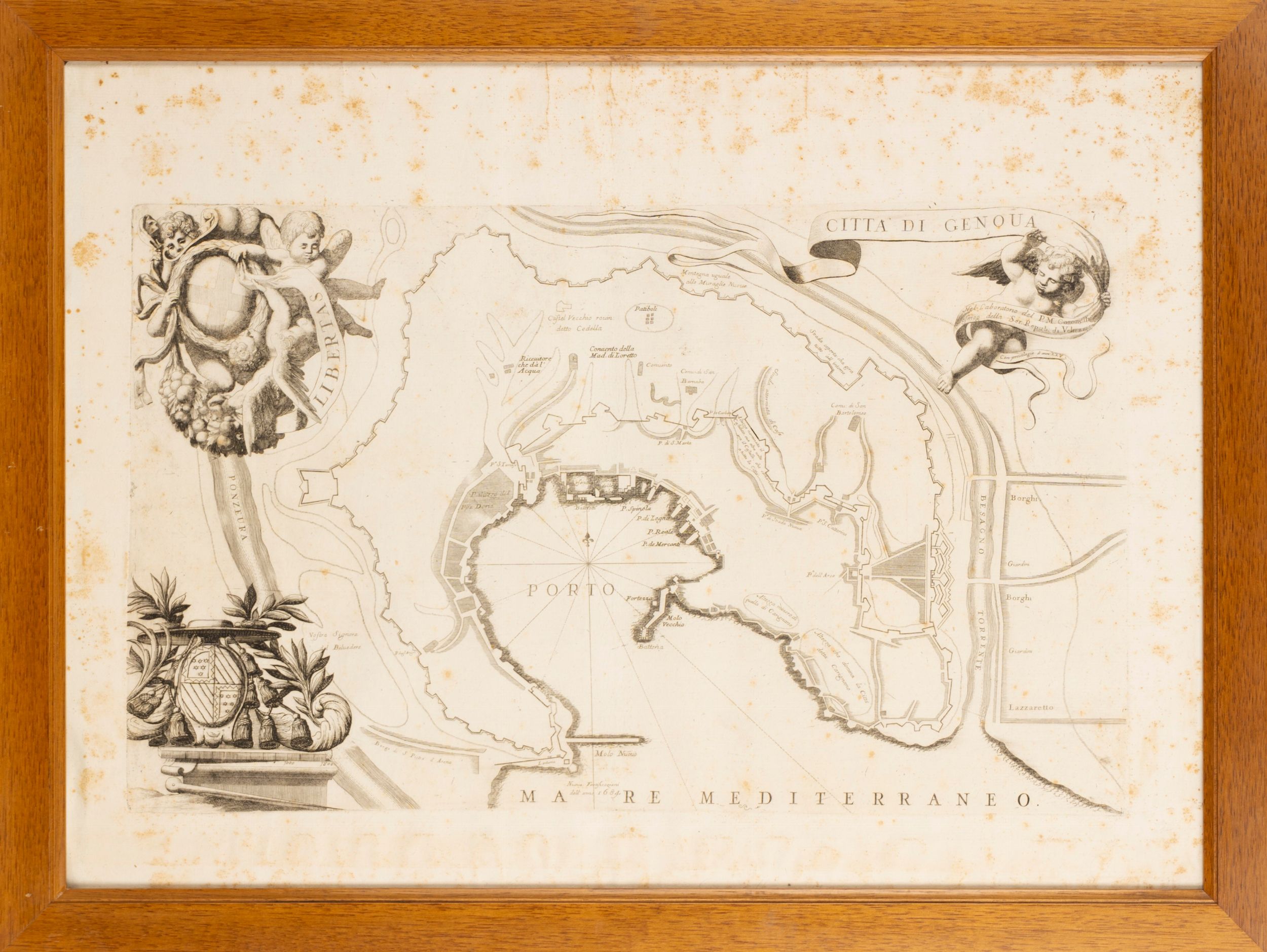 1720 Lineare raffigurazione della città di Genova con le nuove fortificazioni dell'anno 1684. Titolo entro cartiglio retto da putto e stemma della repubblica di Genova a sinistra. Fioriture.