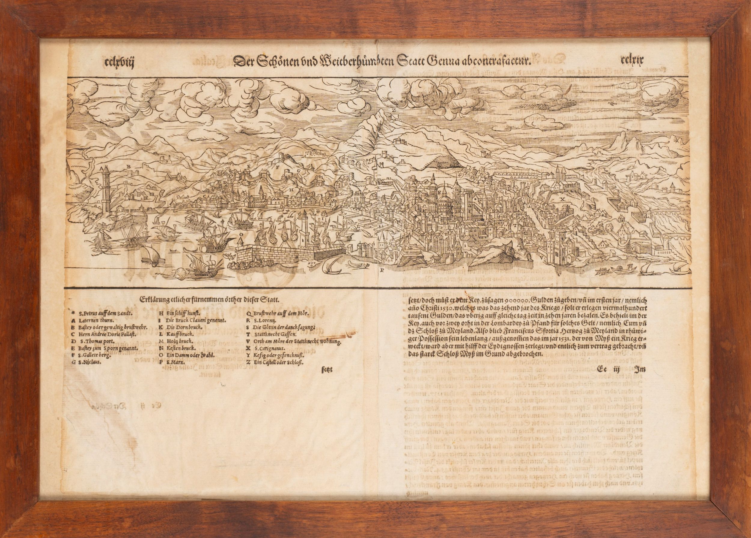 40 x 14 stampa su due fogli 1578 Xilografia di una delle prime vedute a volo d'uccello della città di Genova. Stampa tratta dalla Cosmographia Universalis di Sebastian Münster. Lievemente rifilata ai margini esterni.