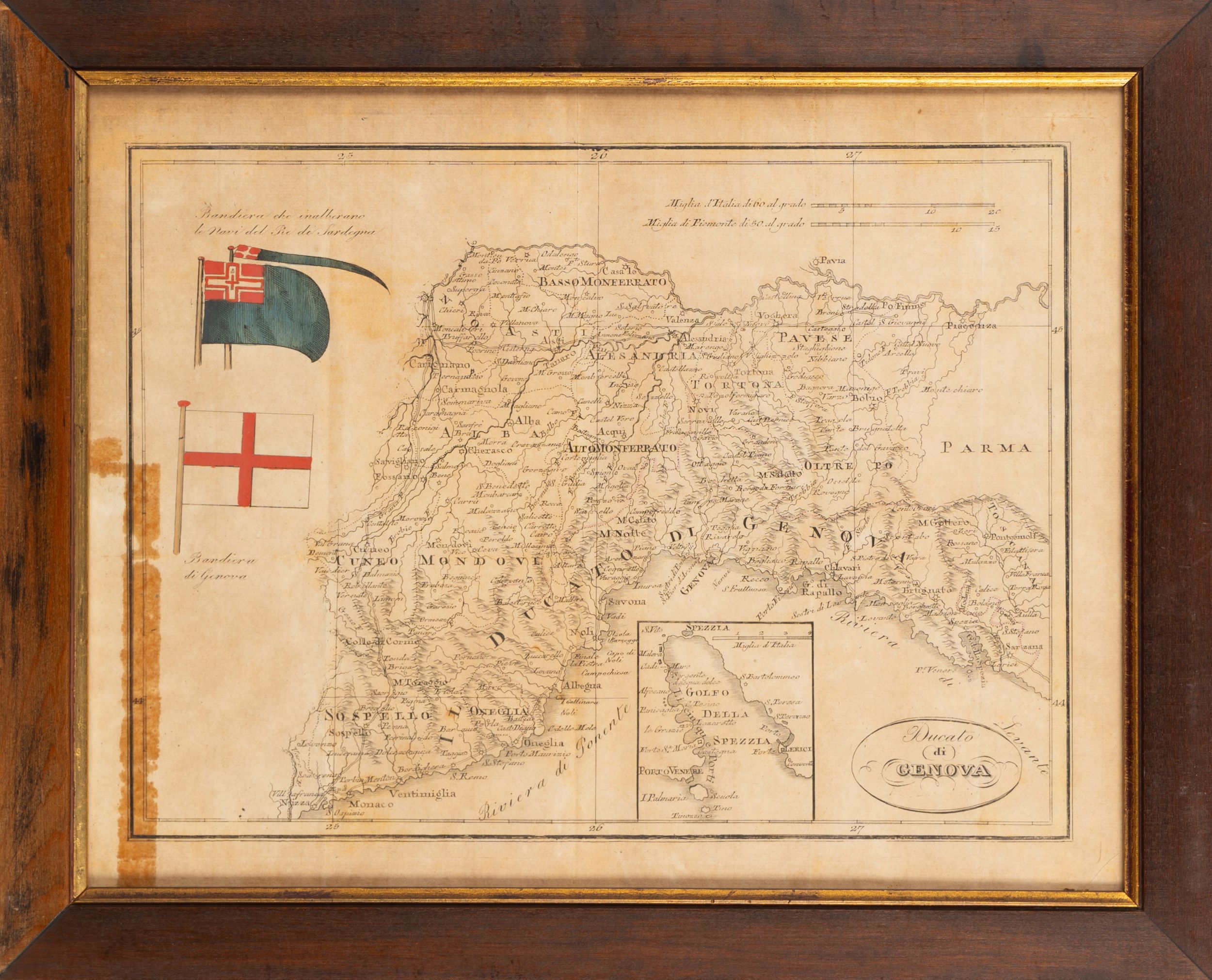 1850 Pianta raffigurante il ducato di Genova recante sulla sinistra le bandiere che inalberano le navi del re di Sardegna.