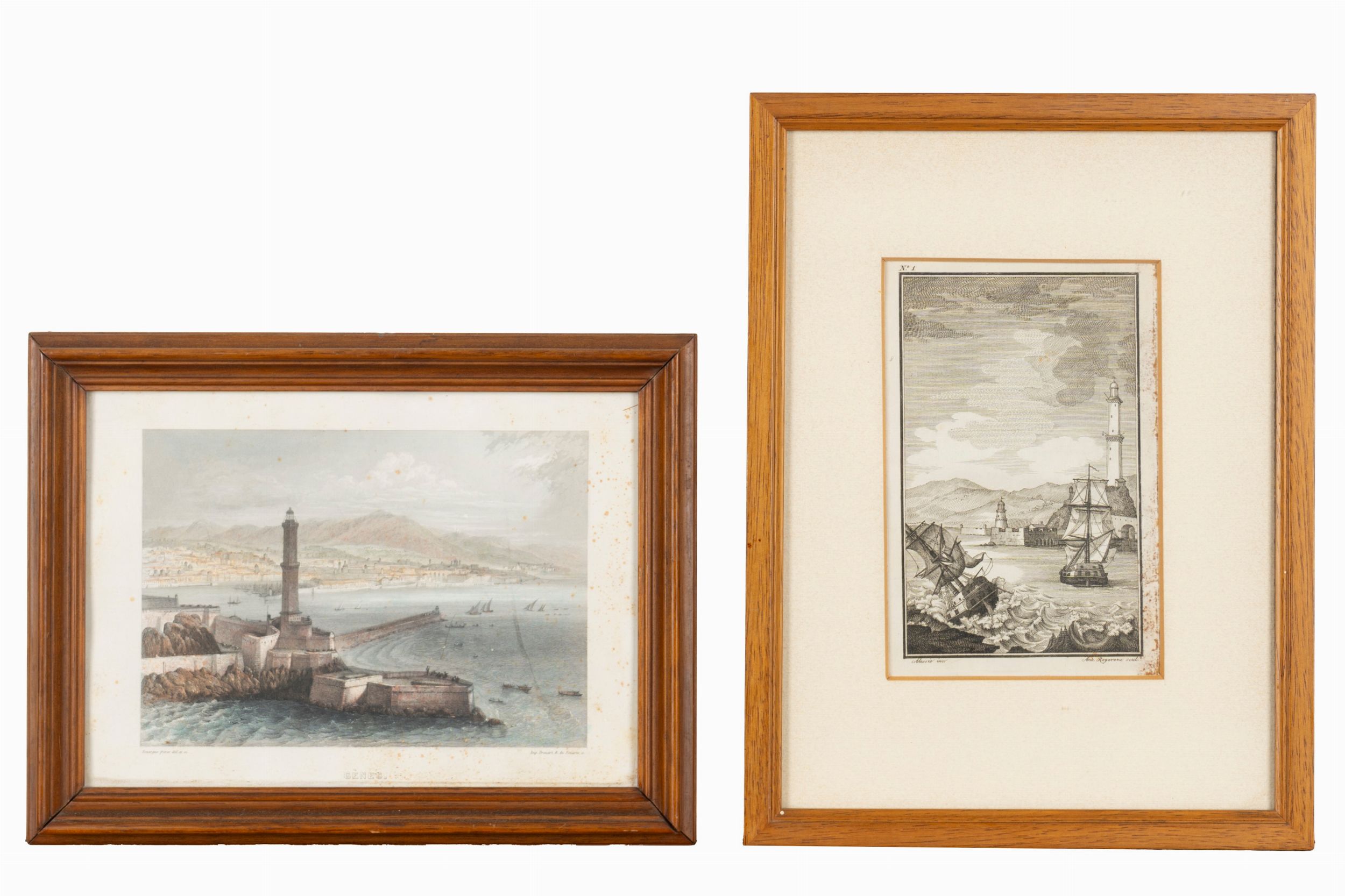 1830 Coppia di incisioni raffiguranti la lanterna (XVIII sec.) insieme ad una stampa che ritrae Lerici e Voltri.