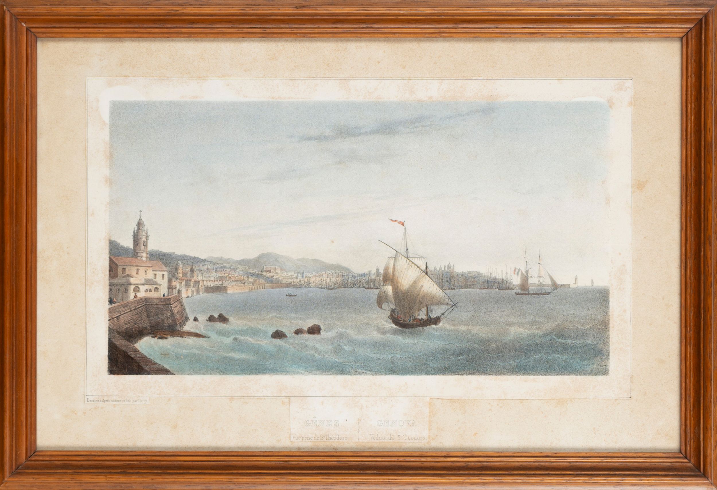 1850 Litografia pubblicata da Lemercier, suggestiva veduta colta da ovest verso il porto, acquarellata coeva.