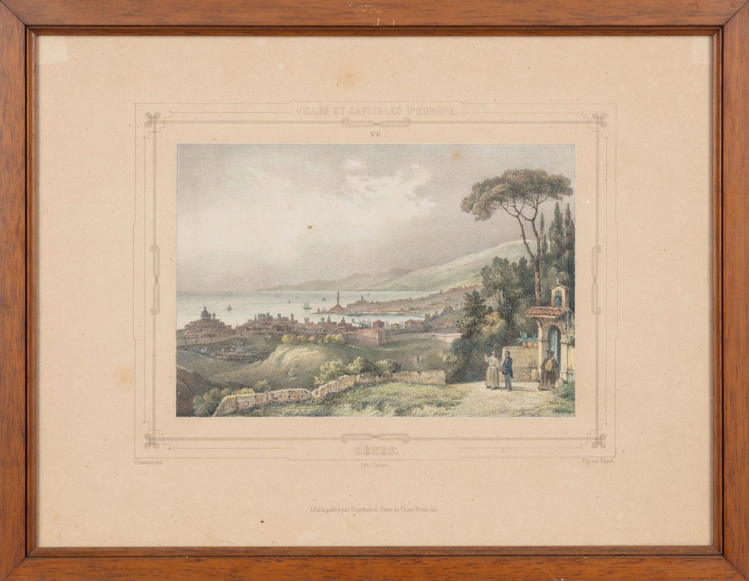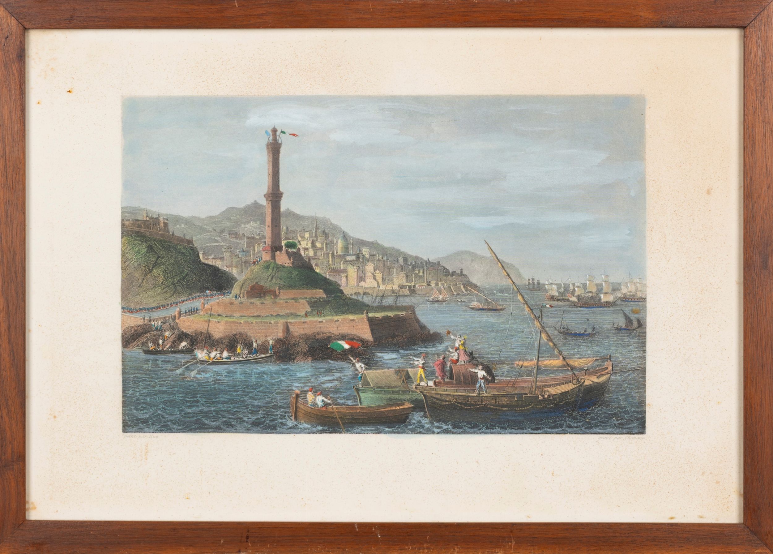 1830 Serie di tre stampe acquerellate raffiguranti la lanterna, il porto e la città di Genova visti da diverse prospettive.