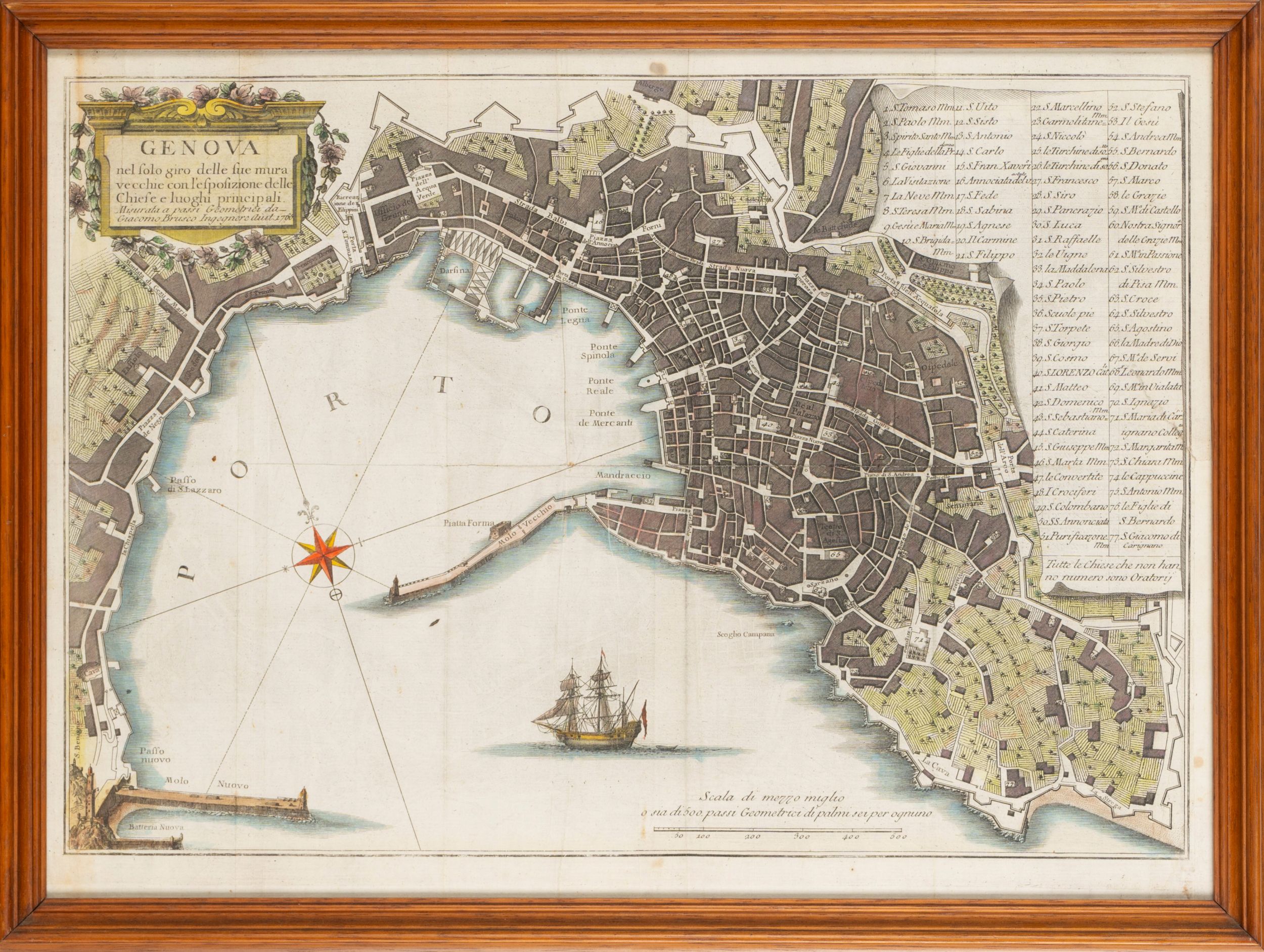 43 x 32 1766 Importante pianta di Genova preparata da Giacomo Brusco e incisa da G. L. Guidotti. Pianta della città di Genova entro le mura trecentesche, presenti settantasette rimandi di edifici rilevanti.