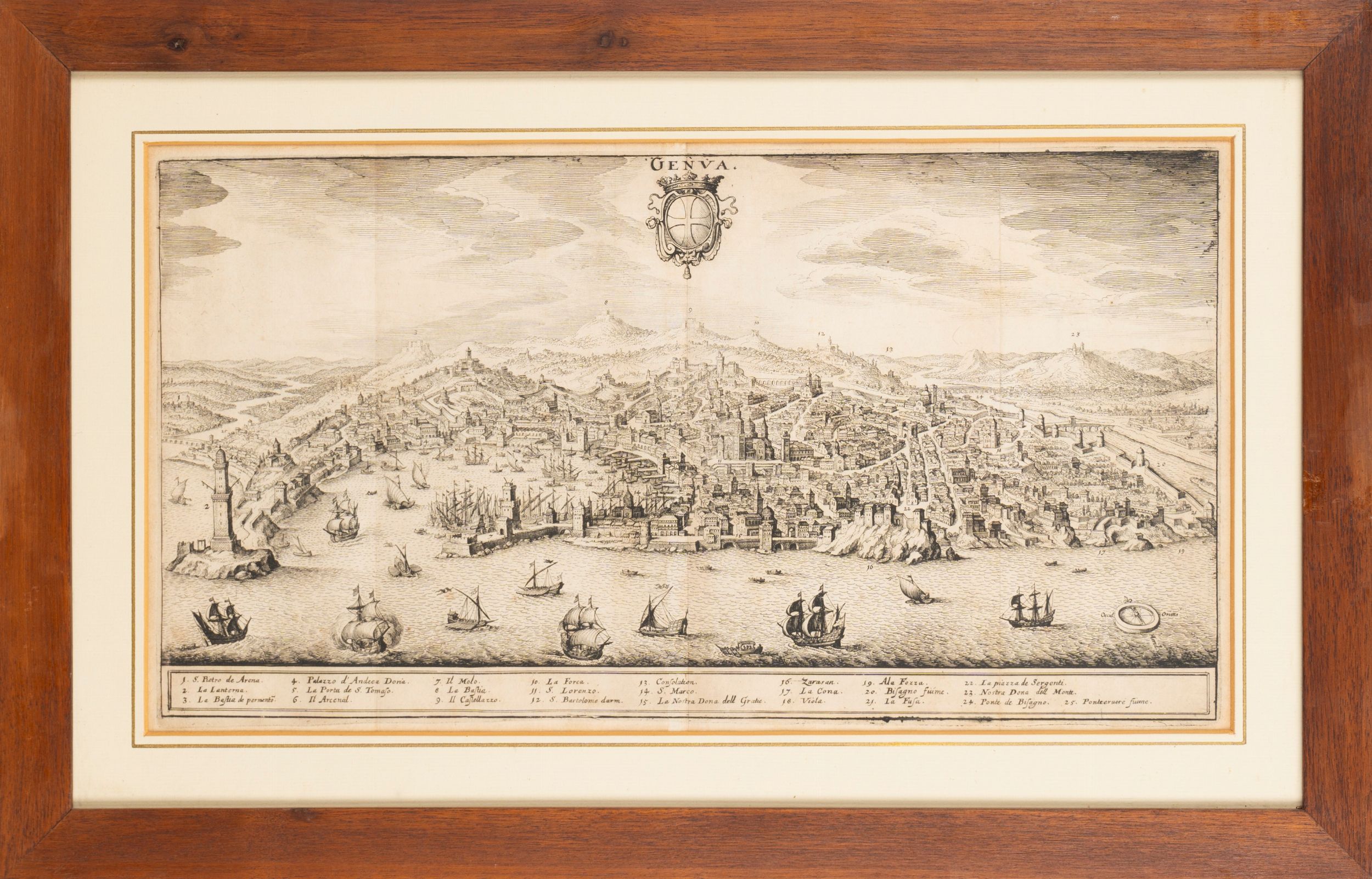 40 x 22 1650 Stampa realizzata da Merian mostra dettagliata veduta a volo d'uccello, presa da un immaginario punto sopra al mare. Legenda con venticinque loghi notevoli, rosa dei venti a destra e ricca serie di imbarcazioni, in alto stemma della repubblica di Genova.