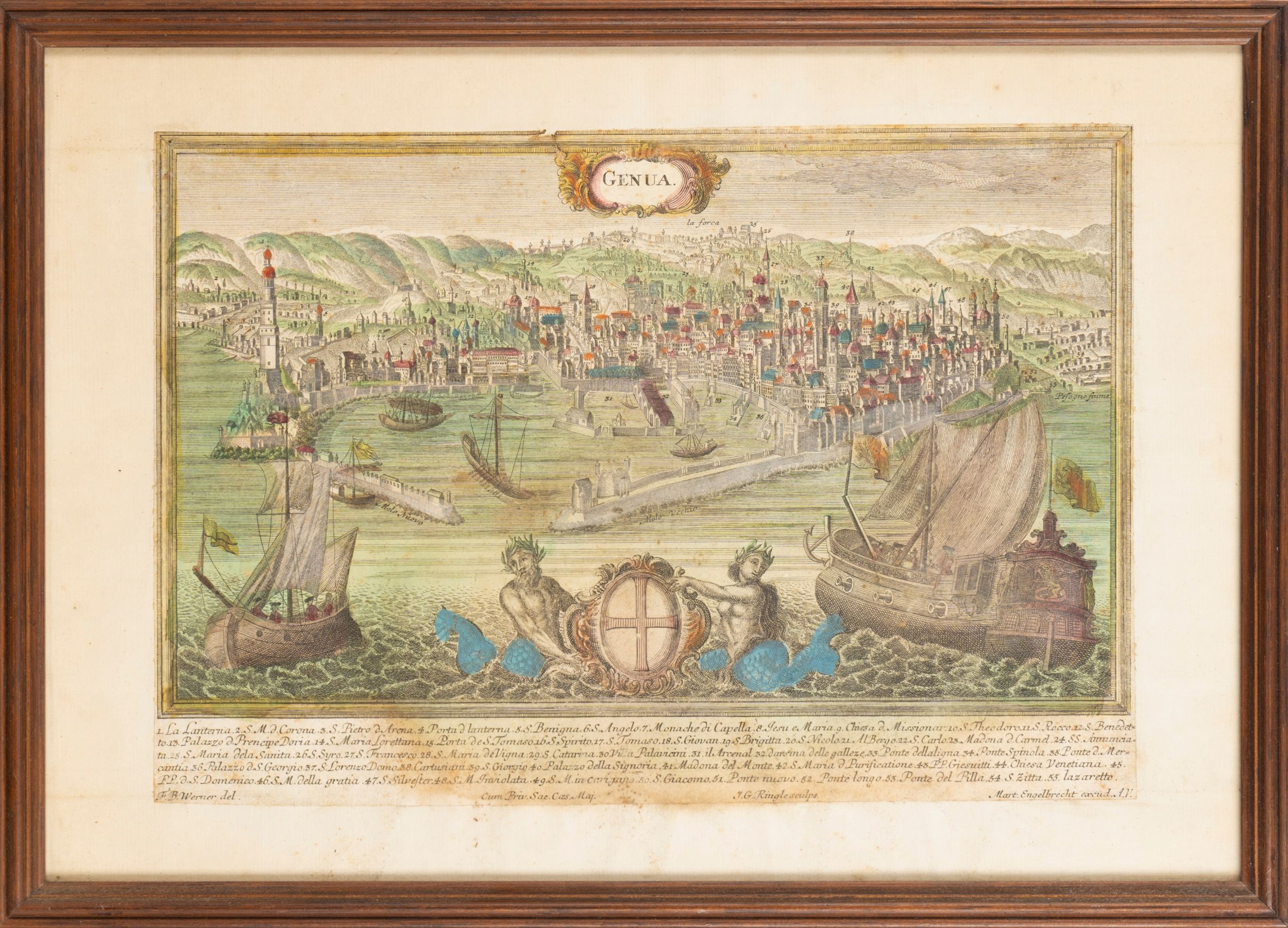 1725 Engelbrecht Map Genoa 1725 Ringle Werner. Raffinata incisione su rame finemente acquerellata con veduta a volo d'uccello della città di Genova. Stemma sorretto da due tritoni e due velieri in primo piano.