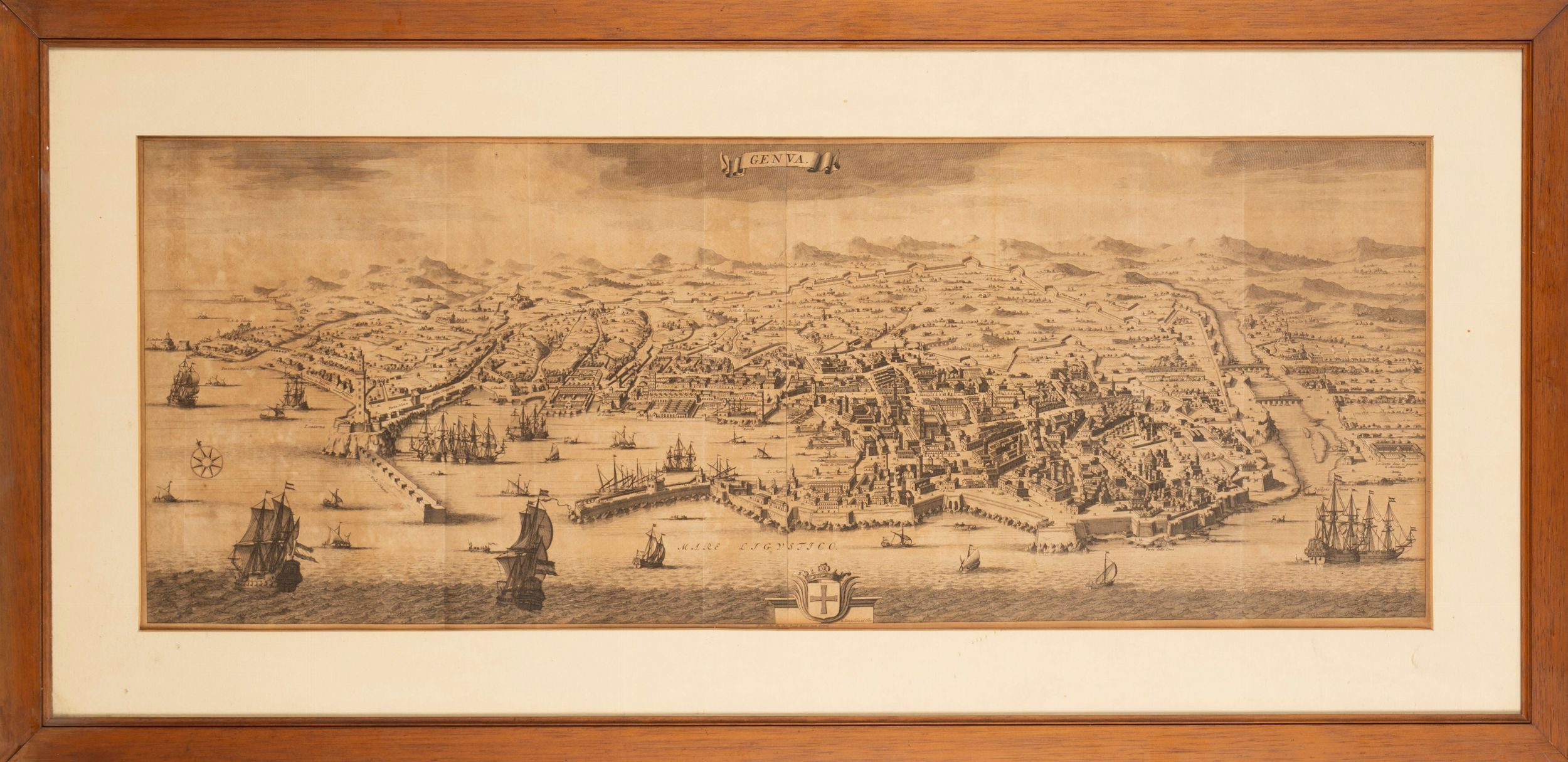 82 x 31 1729 Grande veduta di Genova a volo d'uccello, opera di Daniel Stoopendaal e impressa a Leida nel 1729ca. da P. Vander Aa. Dettagliata descrizione con l'indicazione dei singoli palazzi e delle varie strutture architettoniche. In primo piano galeoni e imbarcazioni varie.