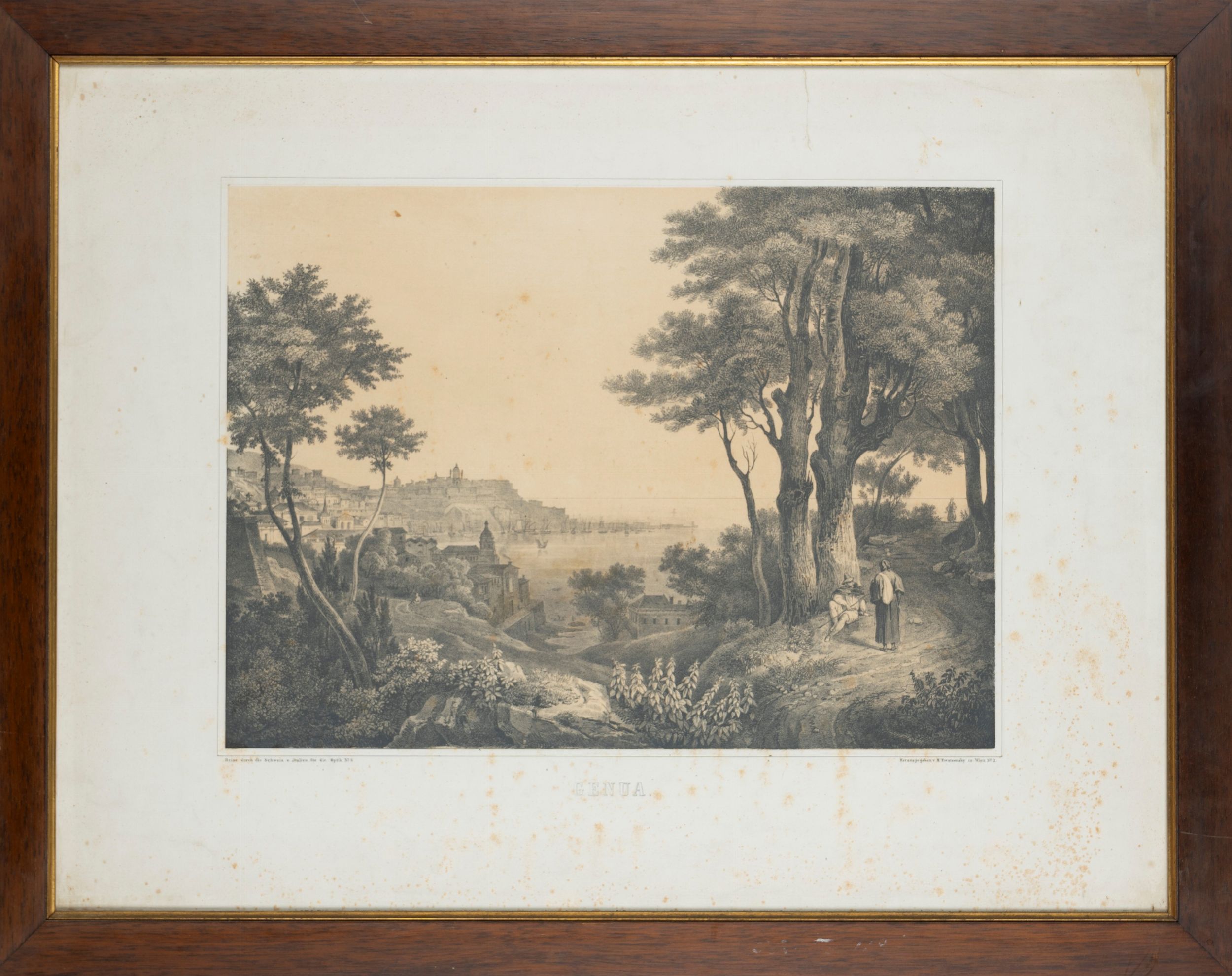 1880 Scorcio del porto e veduta della città di Genova, preso da un'altura collinare. Stampata a Vienna.