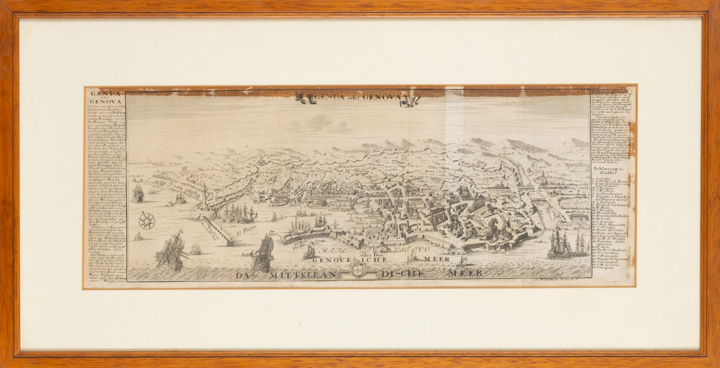 47 x 17 1720 Bella veduta di Genova a volo d'uccello, incisa per il Curioses staats...theatrum edito ad Augusta da Gabriel Bodenehr. Ai lati della stampa due colonne di testo che descrivono in tedesco la storia e la geografia di Genova ed elencano in italiano trenta luoghi notevoli del centro storico.