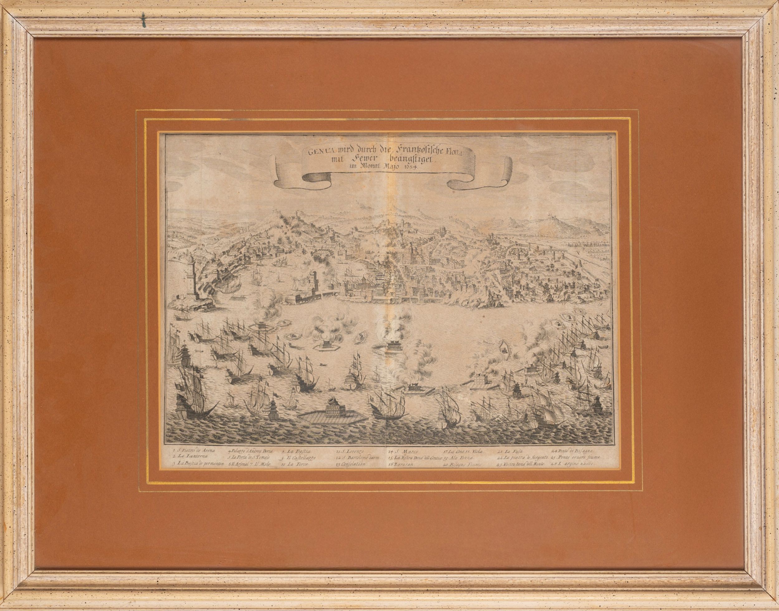40 x 29 1684 Genua mird durch die Frankosische Flotta mit Femer beangftiget, im Monat Majo 1684. (Genova fu attaccata dalla flotta francese nel mese di Maggio 1684) Da Theatrum Europaeum pubblicazione in 21 volumi sulla storia della terra curata da Merian e uscita tra il 1633 e il 1738. Incisione in rame brunita.