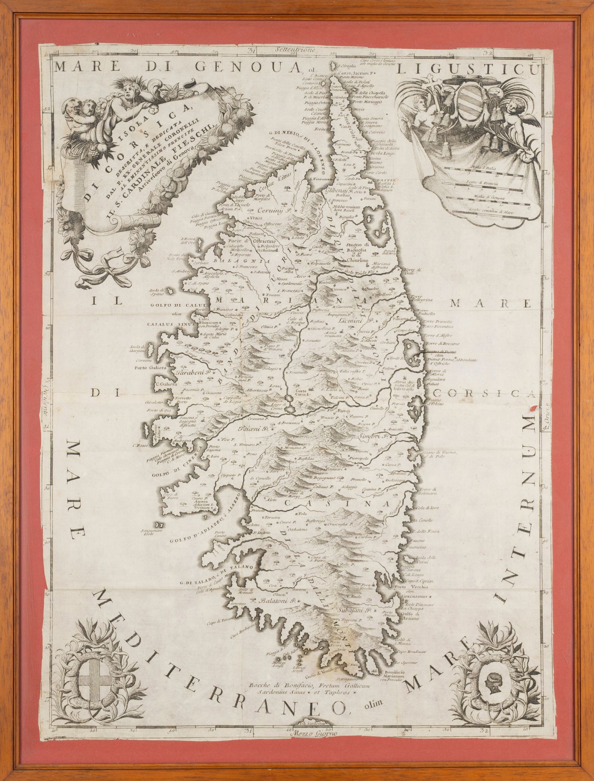 45 x 61 1680 Decorativa e ricercata carta della Corsica, tratta dal C orso geografico universale di Coronelli. La carta è priva di testo descrittivo al verso che è, invece, presente negli esemplari inseriti nell' Isolario del 1696. Cartigli decorati agli angoli, recanti stemma della Repubblica di Genova e della Corsica. Dedicata al Cardinale Fieschi, Arcivescovo di Genova. Margine rifilato.