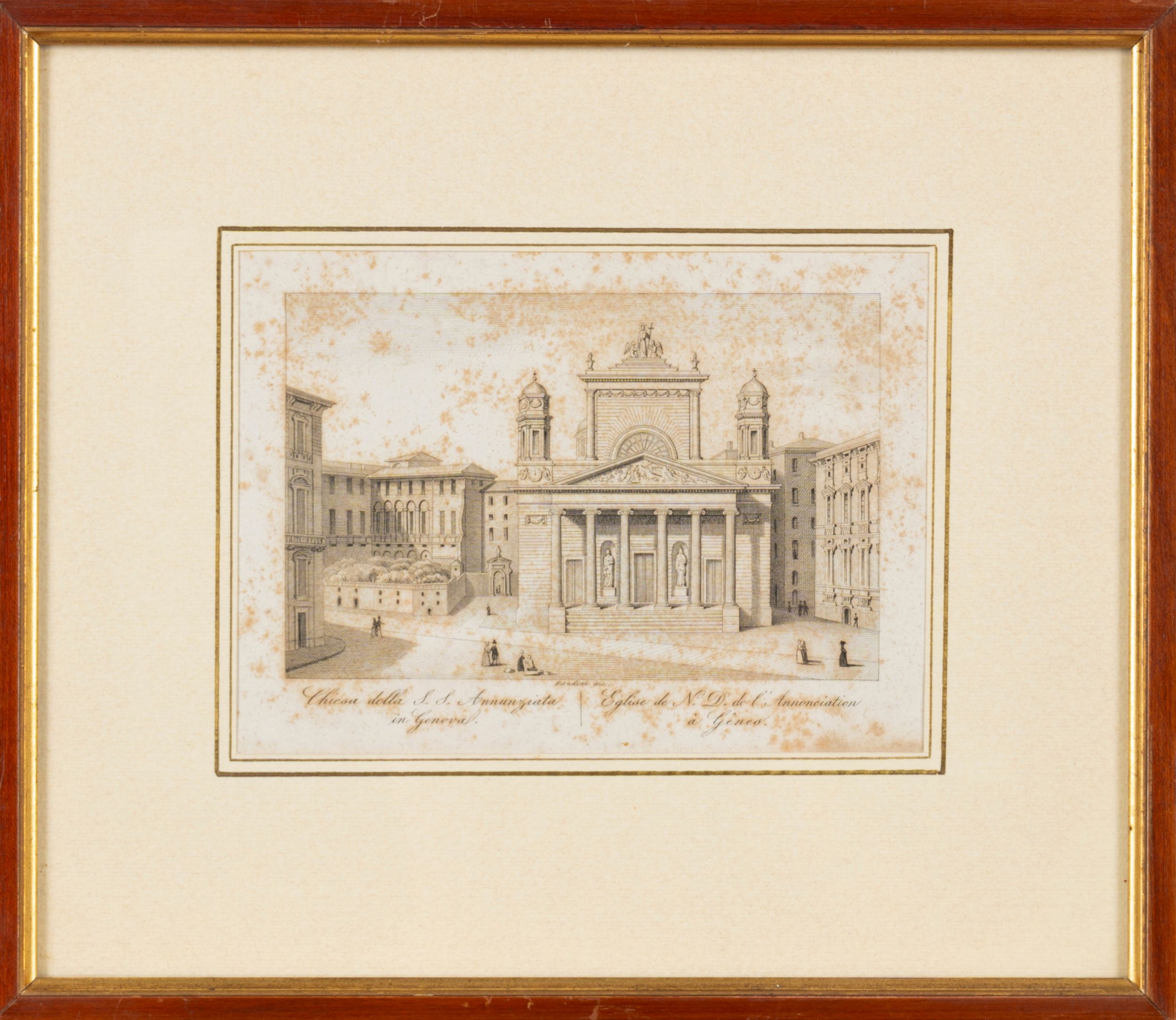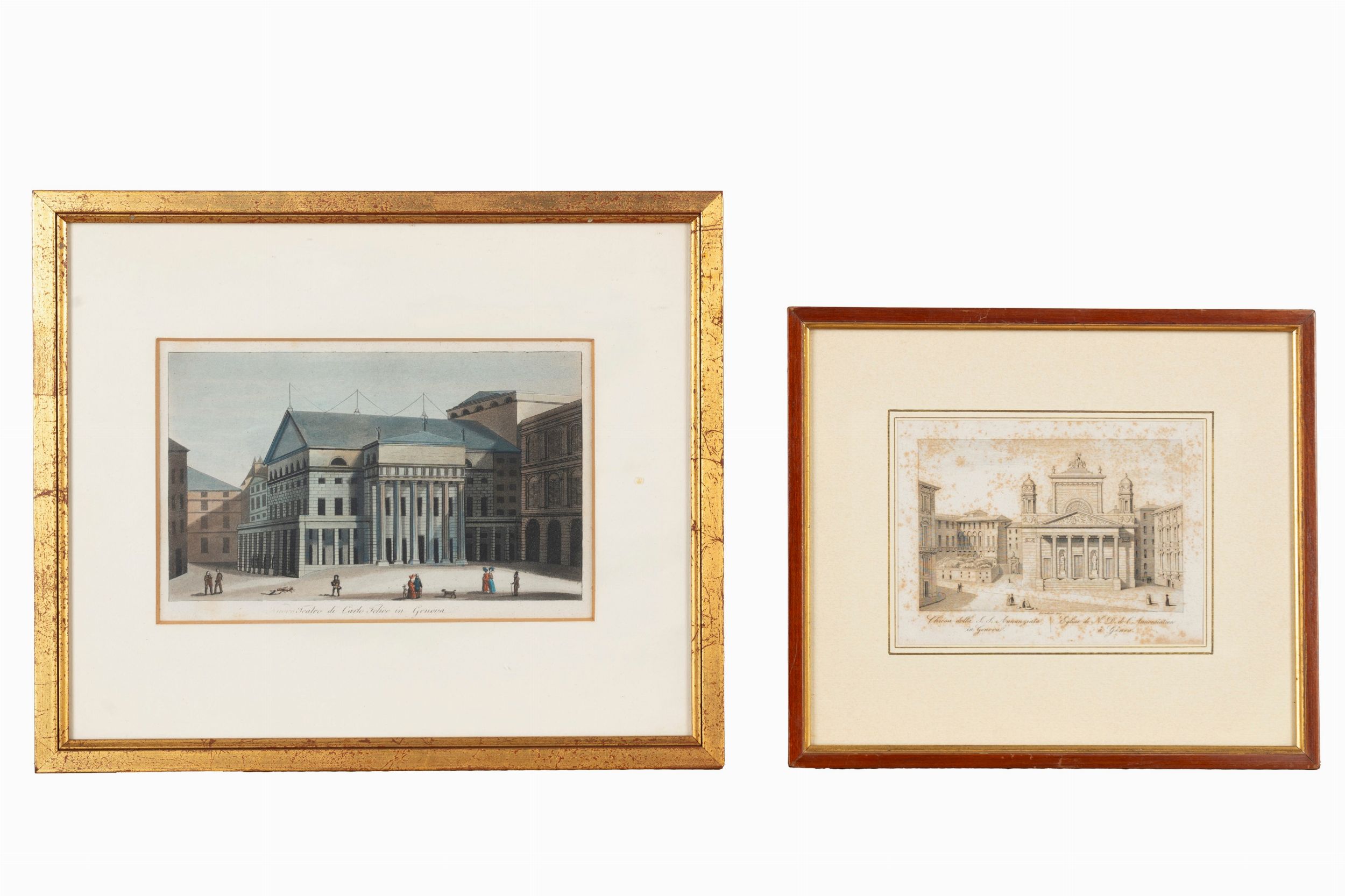 1800 Bella veduta acquarellata del Carlo Felice; insieme nel lotto altre quattro vedute di palazzi e scorci genovesi.