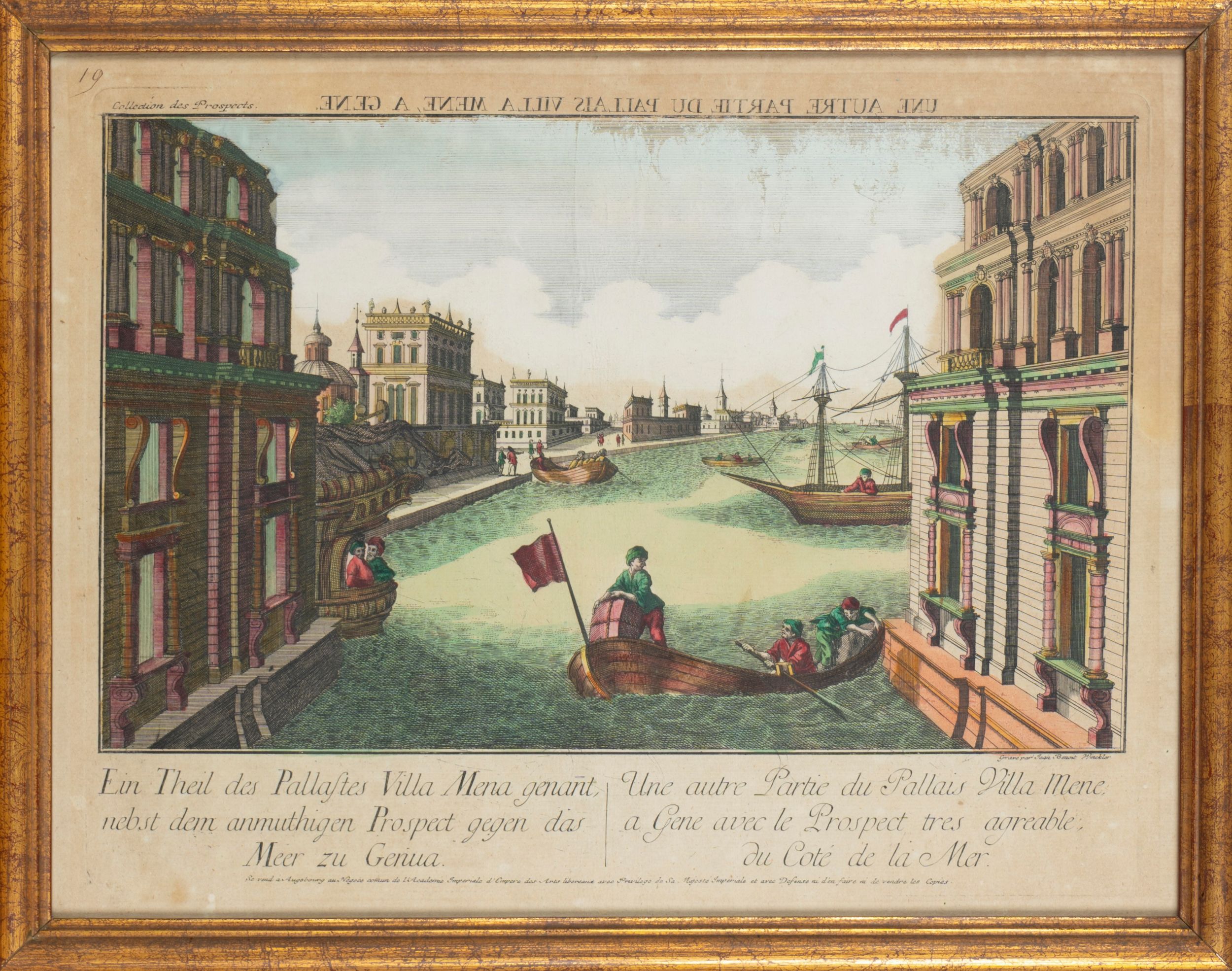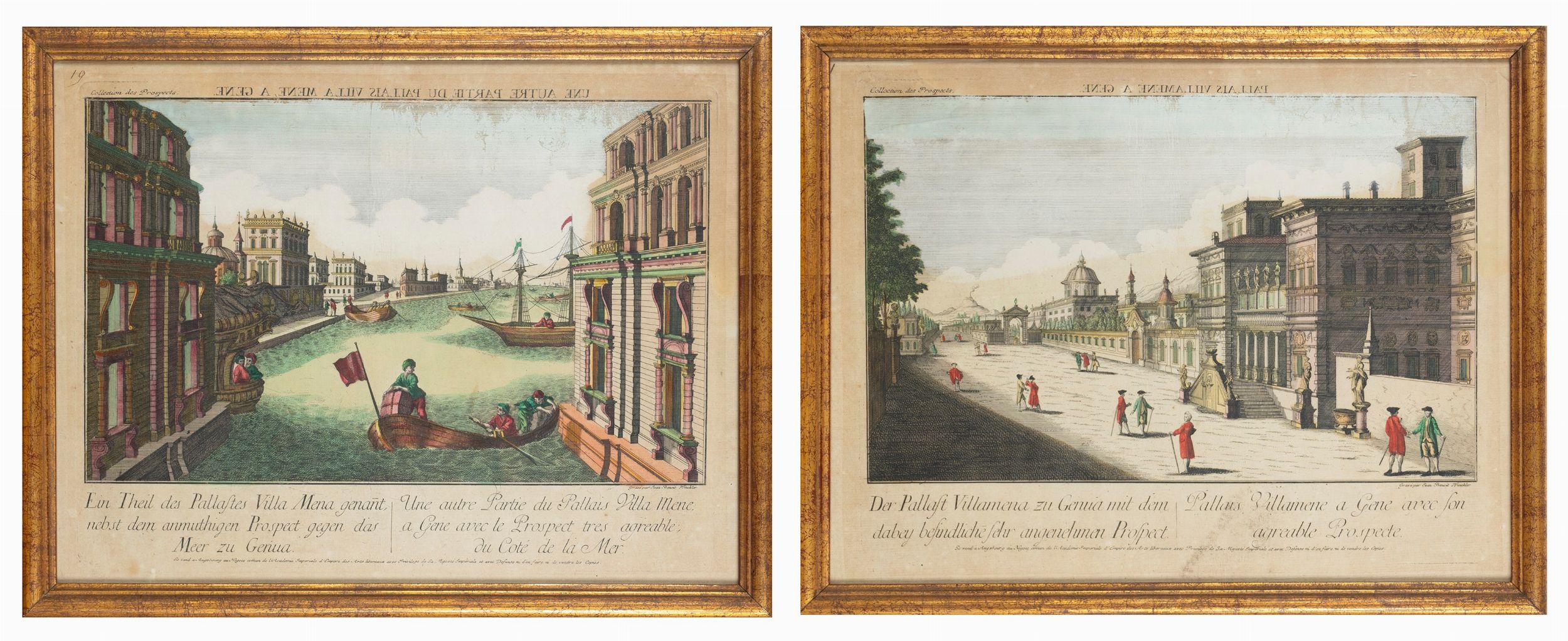 1770 Due belle stampe acquarellate incise da Jean Benoit Winckler, raffiguranti il Palazzo Villamena a Genova da diverse prospettive.