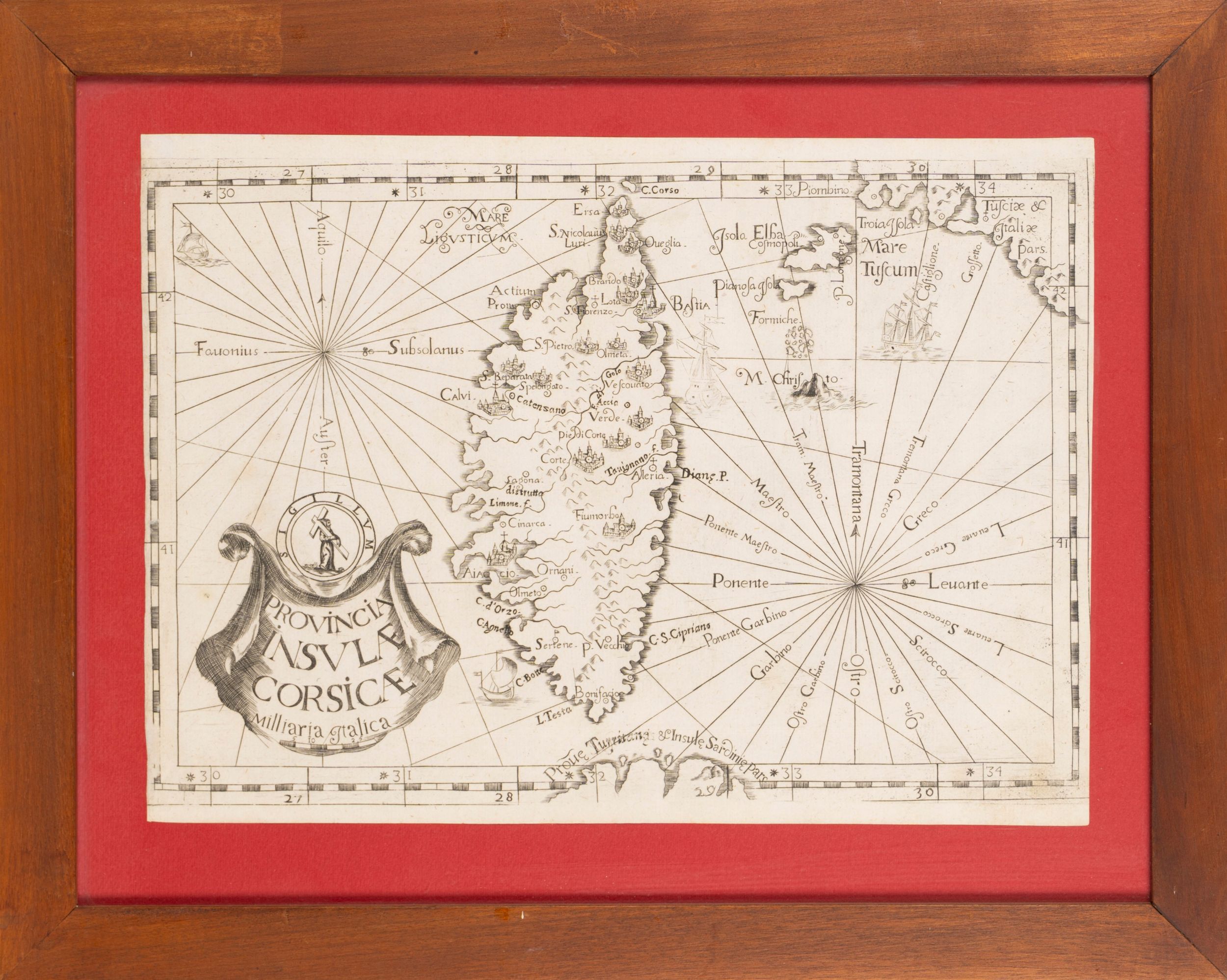 1712 Carta geografica raffigurante il territorio della Corsica. Si notano l'isola d'Elba, Pianosa, Monte Cristo e le Formiche.