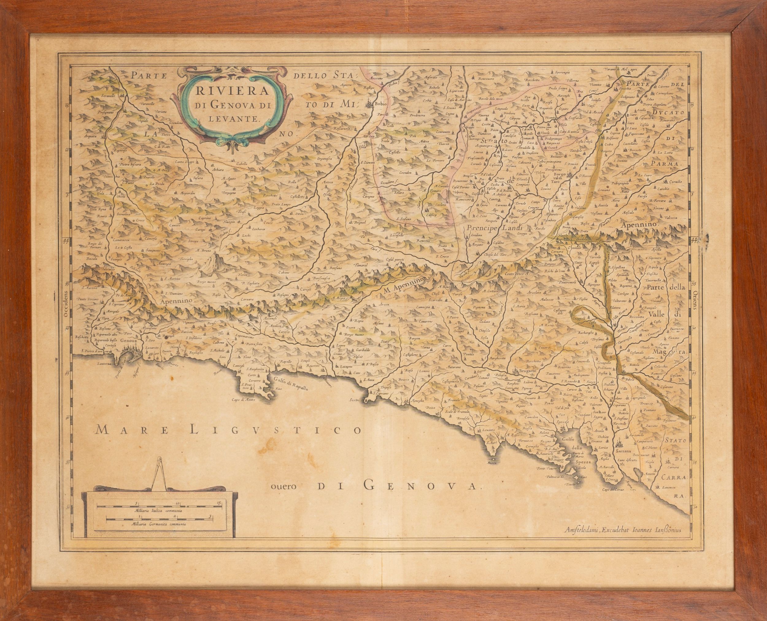 1620 Coloritura coeva, brunita. Titolo entro cartiglio in alto a sinistra, in basso a sinistra tabella con misurazione miglia marine.