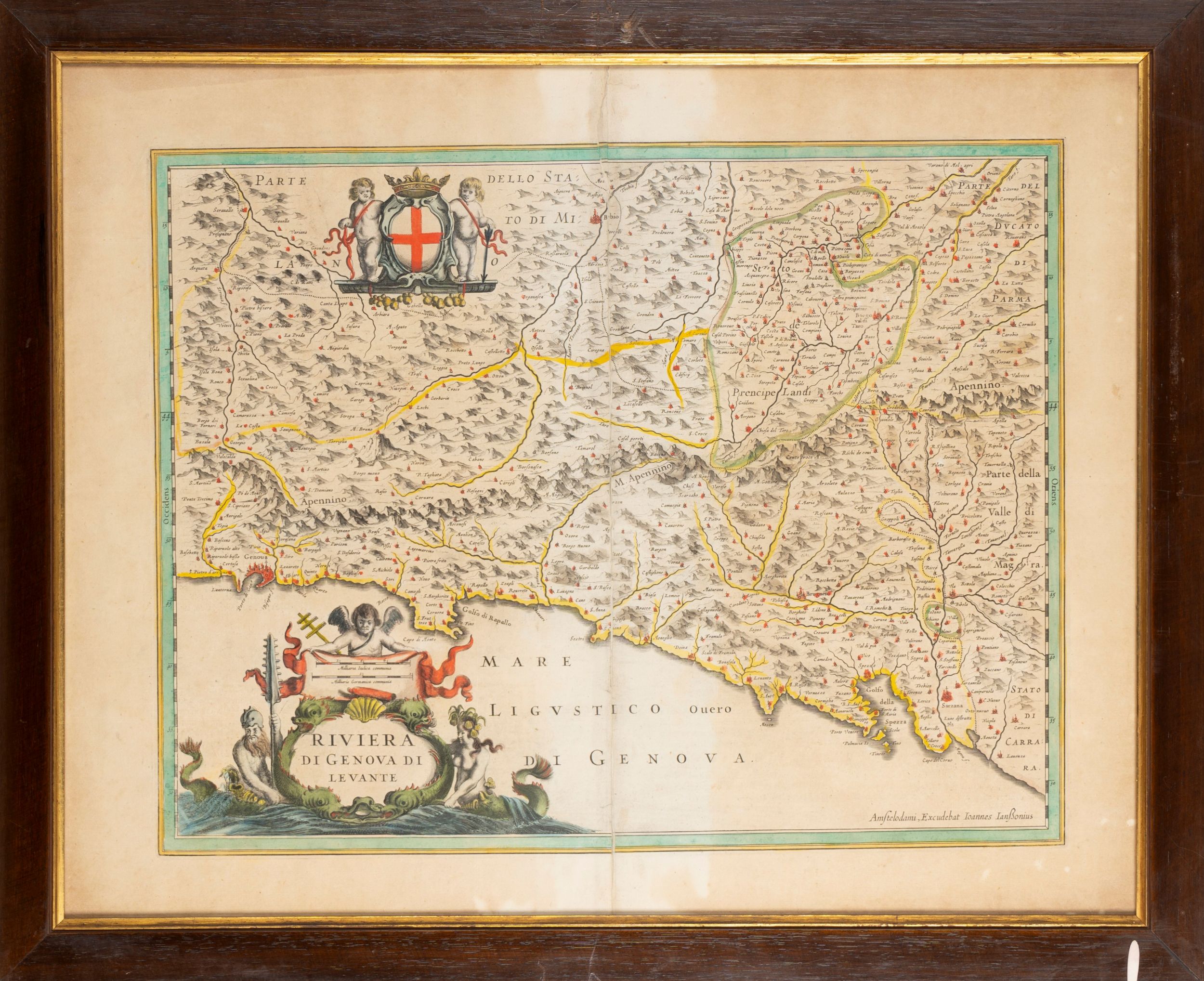 49 x 39 (alla battuta) 1620 Copia dell'omonima carta composta da Mangini e proveniente da uno degli Atlanti curanti da Jansson. Elegante titolo contenuto in cartiglio ornato da conchiglie e pesci, sorretto da una sirena e un tritone, sormontato da un drappo rosso. In alto stemma della Repubblica di Genova con ai lati due putti alati.