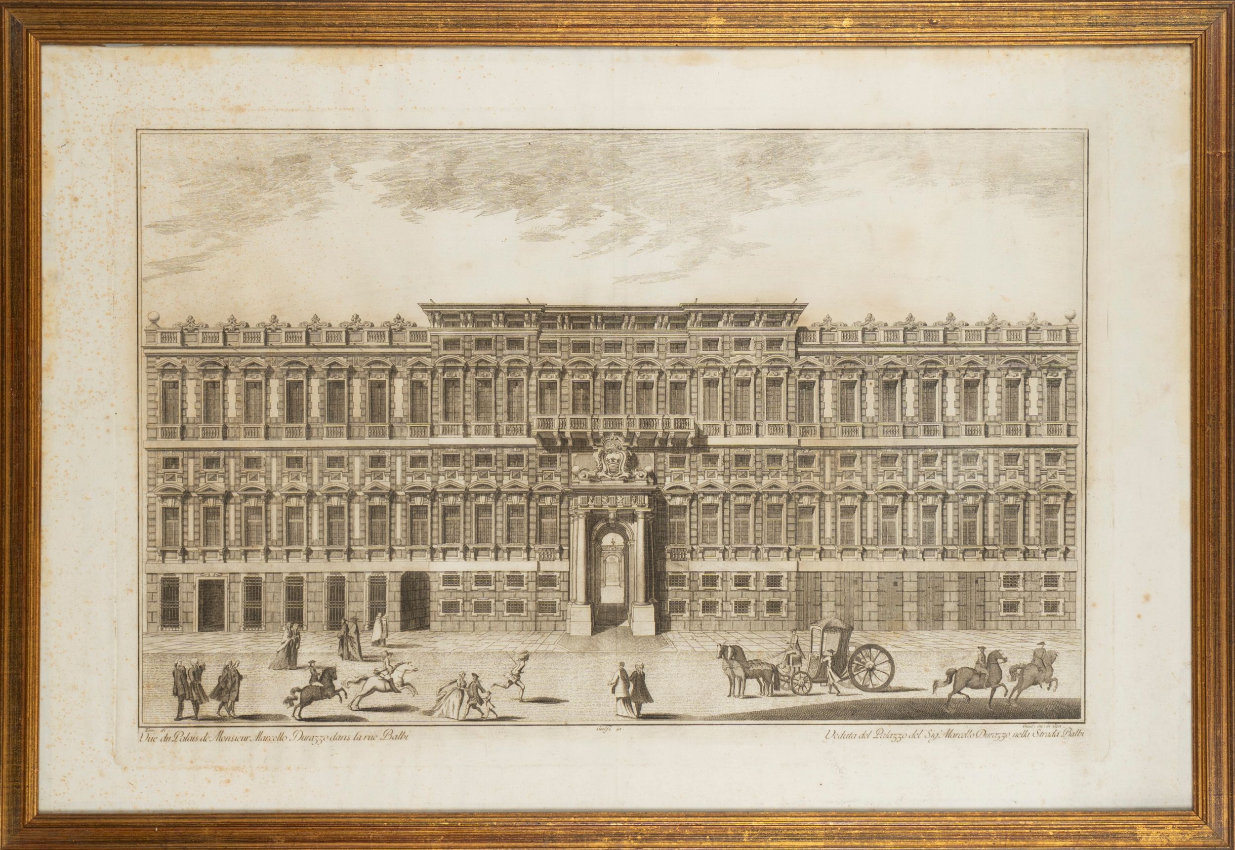 79 x 53 1780 Ottima stampa antica con la facciata del principesco Palazzo Durazzo, oggi Palazzo Reale, il cui lungo titolo recita in italiano “Veduta del Palazzo di S.E. il Signor Conte Durazzo nella Strada Balbi in Genova” ed accanto in francese “Vüe du Palais de Monsieur le Conte Durazzo dans la rue Balbi a Genes”.