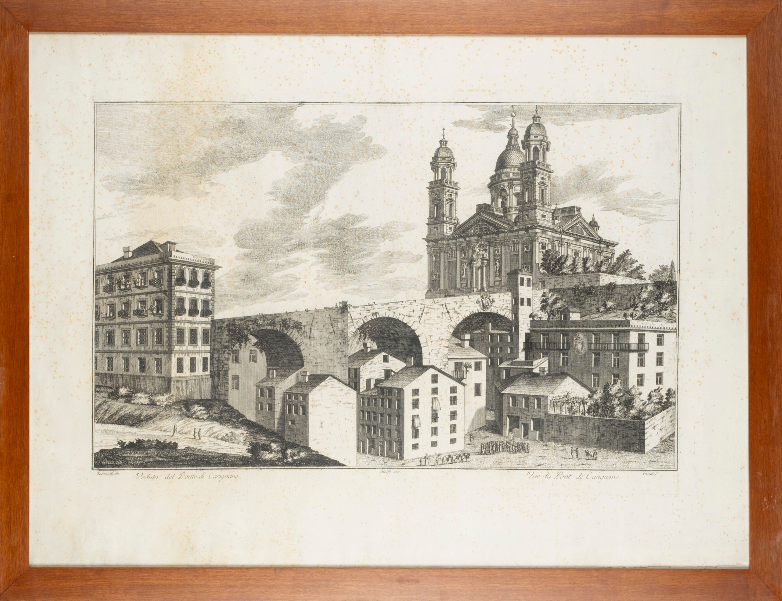 1750 Veduta realizzata da Giolfi e Torricelli, presenta particolare vista del ponte di Carignano. Fioriture.