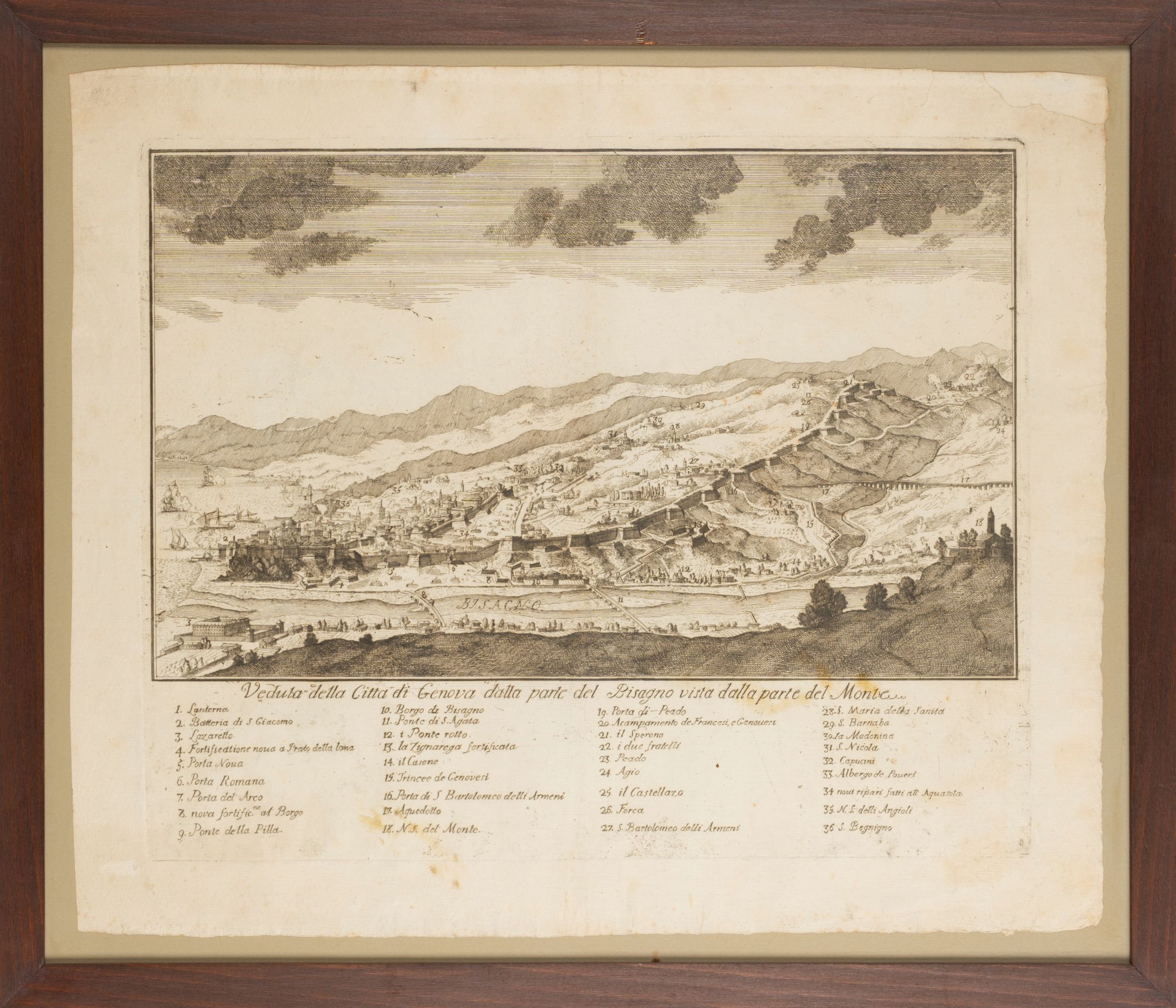 53 x 45 1740 Veduta di Genova presa dalla piana del fiume Bisagno con descrizione della zona prima degli ammodernamenti susseguitisi nell'Ottocento. Si osserva il torrente ancora scoperto con il borgo di Bisagno e il ponte di sant'Agata, le antiche mura che raggiungevano la foce, l'acquedotto. Sotto la veduta legenda a 36 voci con nomi dei luoghi ed enumerate alcune postazioni difensive (2. Batteria di S. Giacomo, 15. Trincee de Genovesi,...).