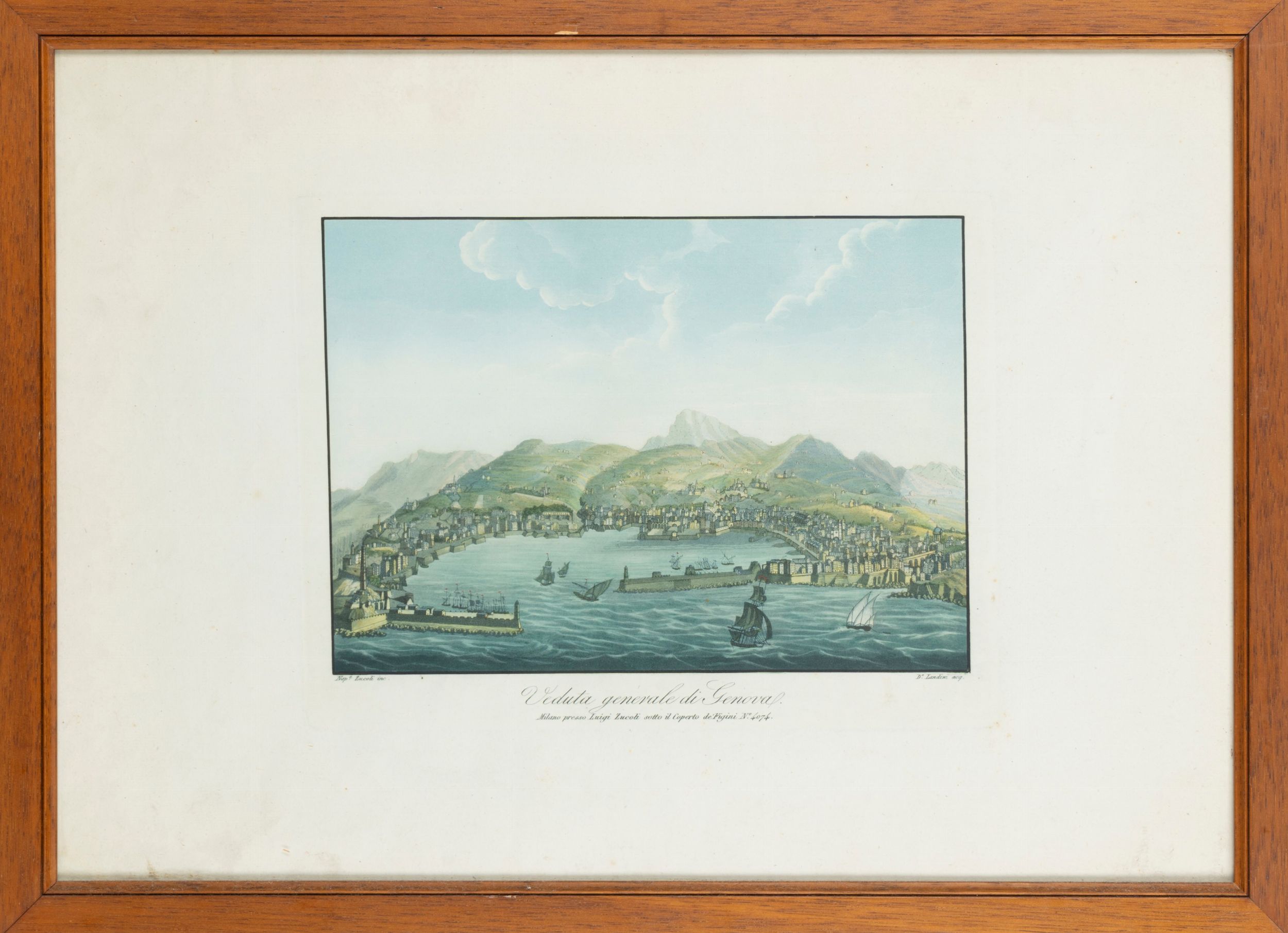 1840 Bella veduta di Genova presa dal mare, finemente acquarellata, incisa da N. Zucoli e colorata da D. Landini, in vendita a Milano da Luigi Zucoli.
