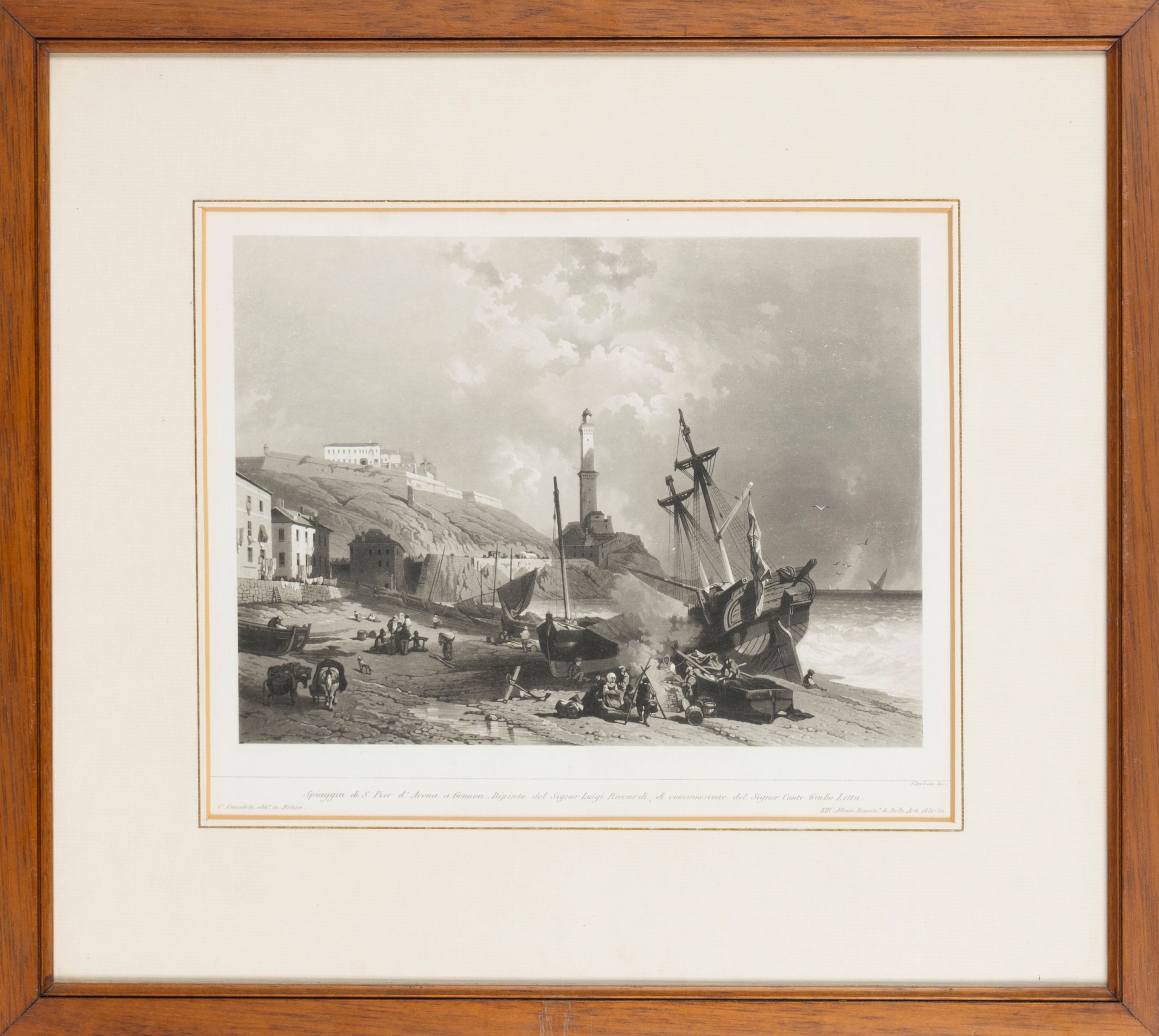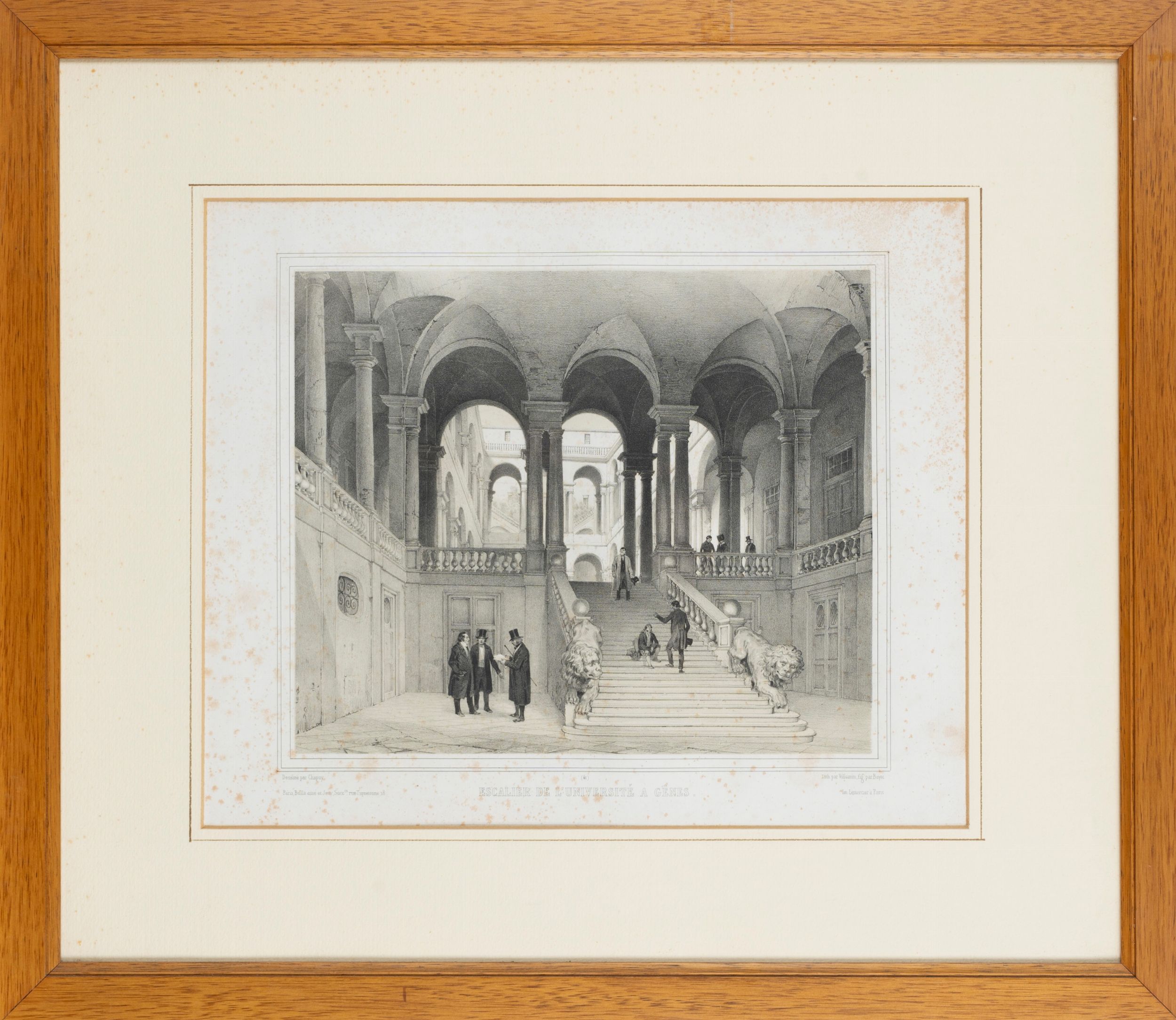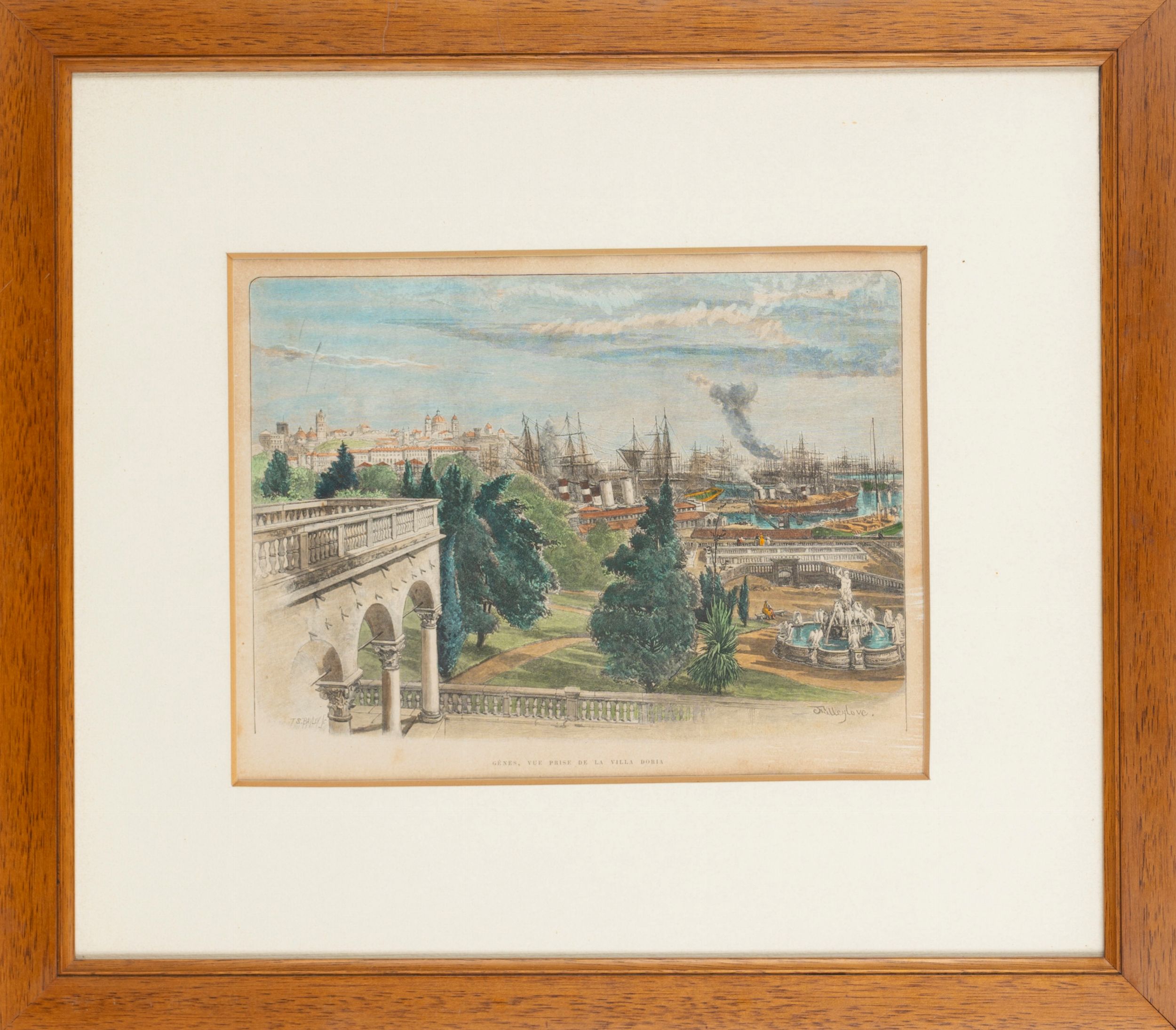 34 x 26 1850 Vedute di Genova - Parte del molo vecchio, stampa disegnata da G. Bisi e incisa da Vassalli; insieme nel lotto veduta di Genova presa da Villa Doria a colori, un'altra della spiaggia di S. Pier D'Arena e un interno dell'università di Genova.