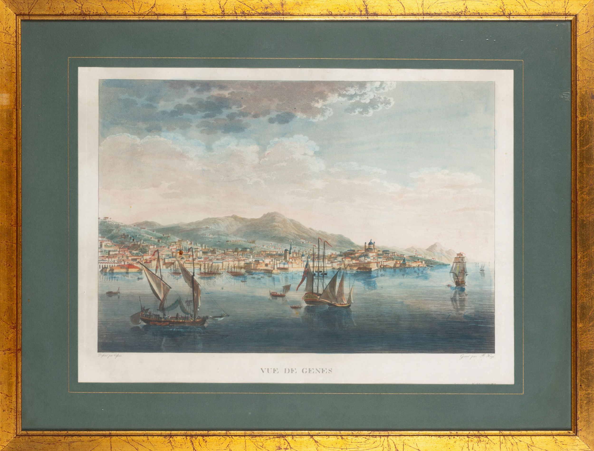 46 x 34 1830 Stampa incisa da Hegi e disegnata da Cassas nel 1830 ca. Stampa della veduta di Genova ritratta dal mare. Il primo piano è animato dalla presenza di alcuni vascelli tra i quali uno battente bandiera inglese. Buon esemplare di questa rara veduta stampata e rifinita a mano all'acquerello all'epoca.