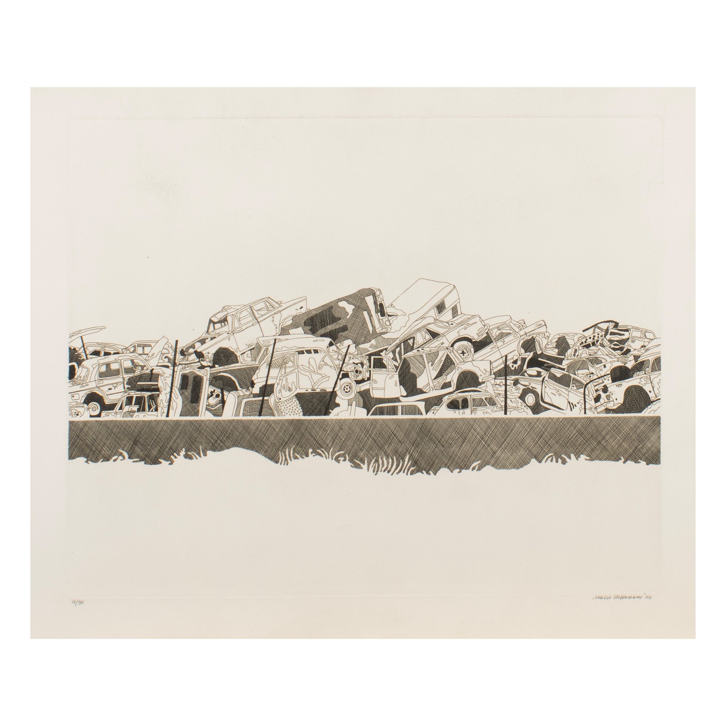 Bergamo 1938 'Cimitero di macchine', 1978, acquaforte, es. 12/90, firmata e datata a matita in basso a destra, timbro a secco Il Torcoliere in basso a destra