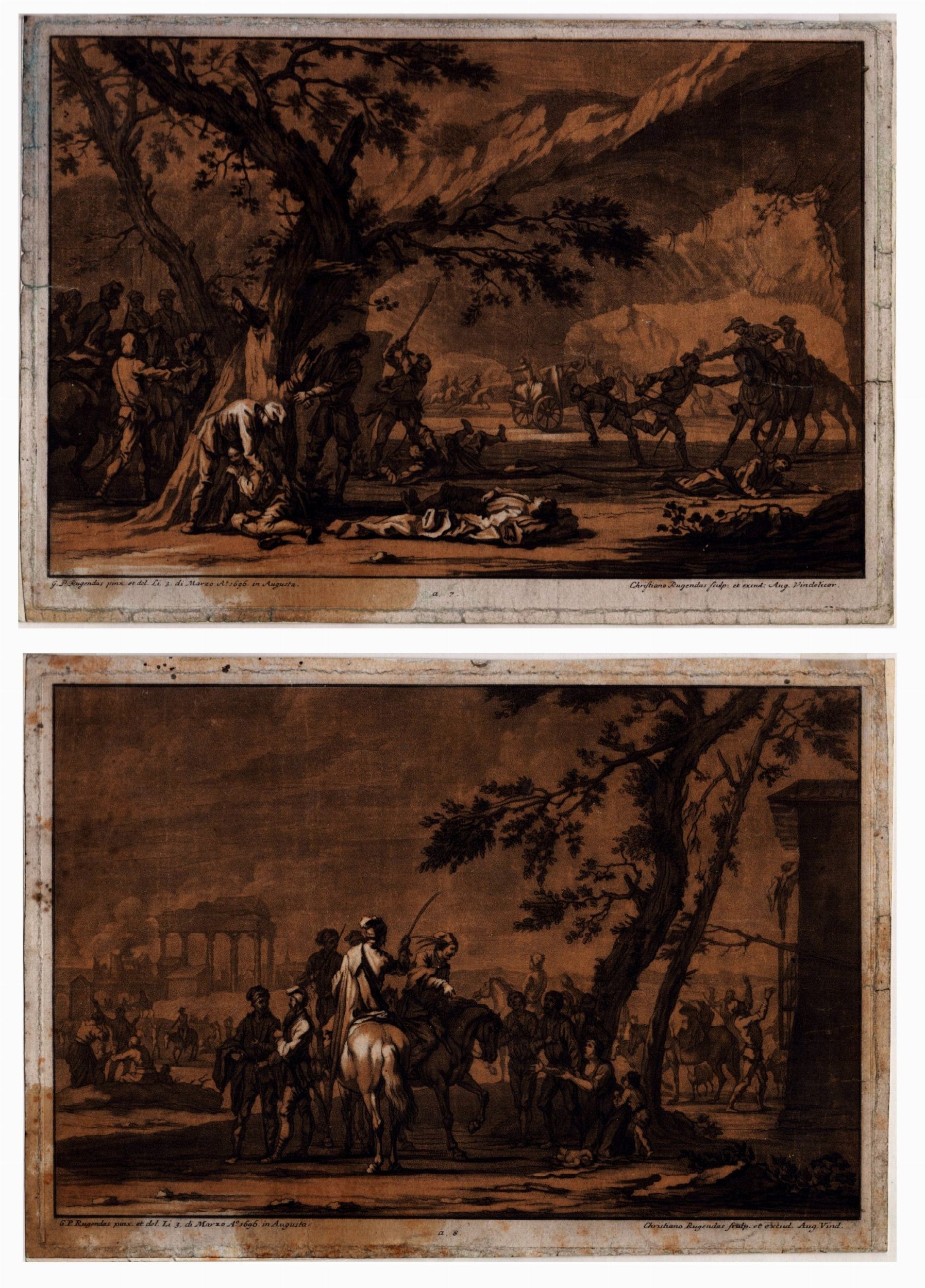 Lotto di due incisioni. Mezzatinta, 170 x 250 mm ca. (cad. foglio) Esemplari con piccoli margini, controfondati. Presentano macchie sparse sui margini.