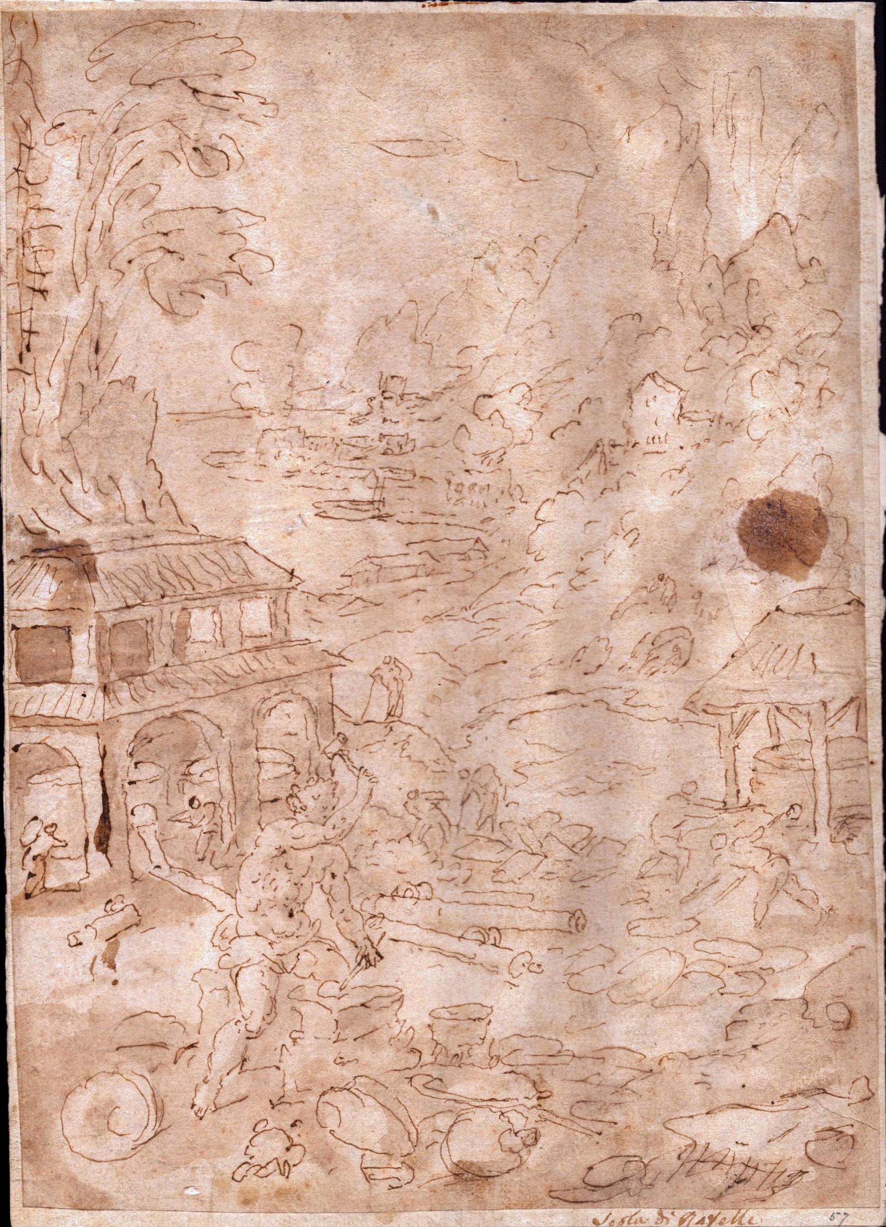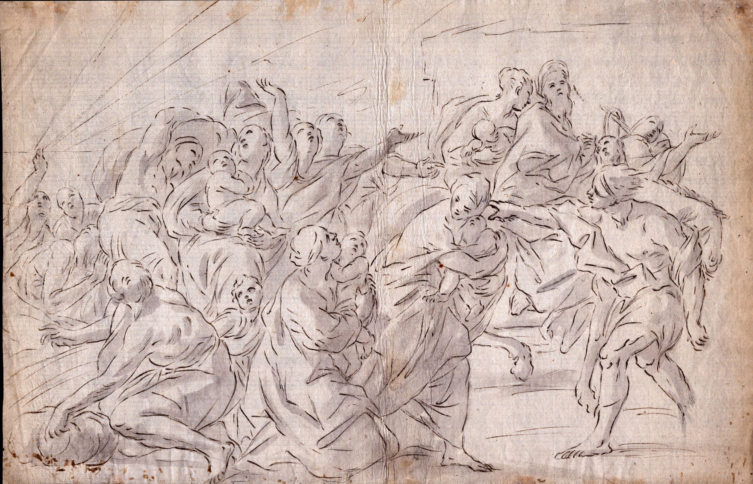 Lotto di cinque disegni: Studio per due figure , inchiostro bruno e tracce matita su carta vergata, 155 x 210 mm Strage degli Innocenti , inchiostro e acquarello su carta vergata con filigrana, 280 x 430 mm Paesaggio con la costa e figure , inchiostro e acquerello su carta vergata controfondata, 315 x 225 mm Studio di sei figure , inchiostro su carta vergata, 435 x 290 mm L'interno di un teatro , acquarello su carta vergata, 195 x 205 mm