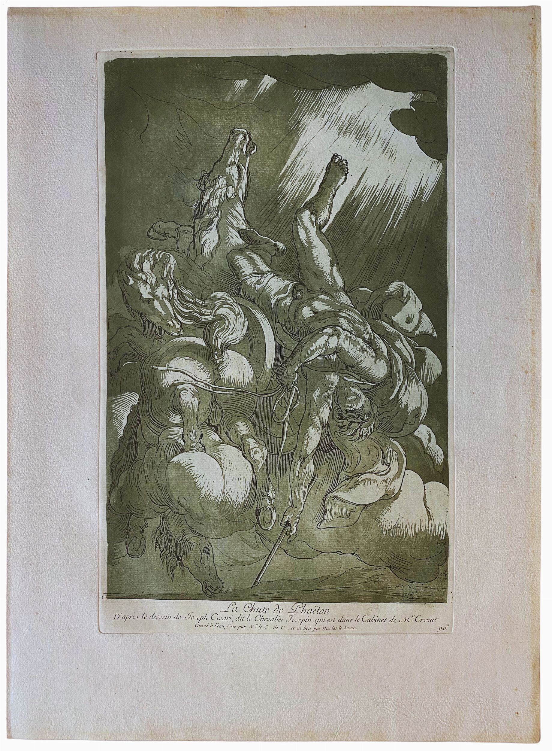 Xilografia (Lesueur) e acquaforte (de Tubières), 440 x 268 mm (lastra), 550 x 402 mm (foglio). Tavola tratta da 'Recueil Crozat'. LeBlanc II.543.24. Bellissimo esemplare stampato a due colori, bianco e verdastro, su carta vergata con filigrana letterale Dupuy Auvergne . Esemplare con ampi margini oltre l’impronta della lastra, in perfetto stato di conservazione, salvo alcune bruniture lungo i bordi e lievi segni di fioritura.