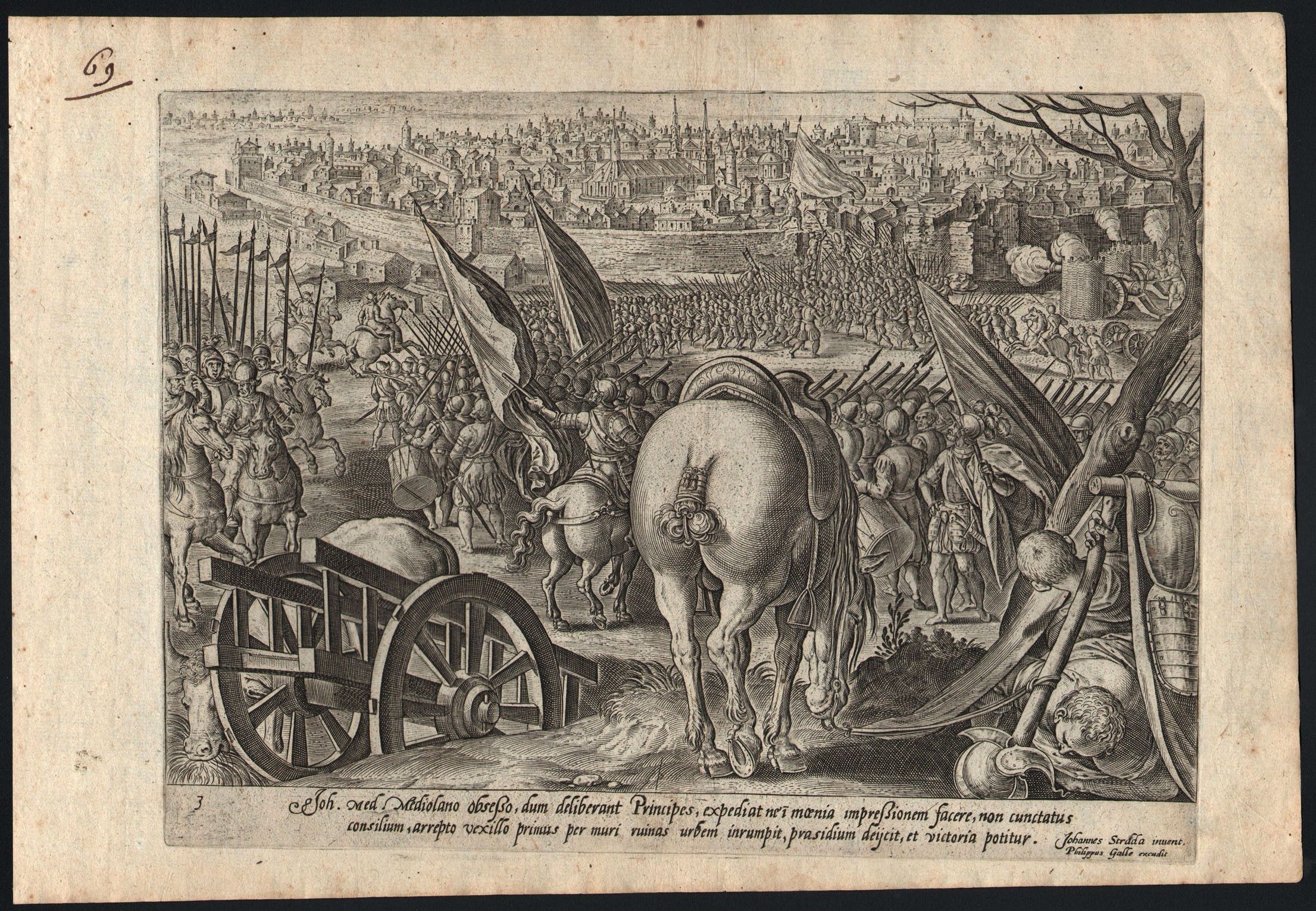 Bulino, 215 x 294 mm (lastra), 250 x 363 mm (foglio). Tavola tratta dalla serie 'Mediceae Familiae Rerum Feliciter Gestarum Victoriae et Triumphi', pubblicato da Philips Galle. Stato II su 3. Hollstein (Stradanus) 355. Bell'esemplare con plate-tone, stampato su carta vergata sottile con filigrana (P gotico con fiore). Carta con un numero a inchiostro di antica mano, ma per il resto in ottimo stato di conservazione.