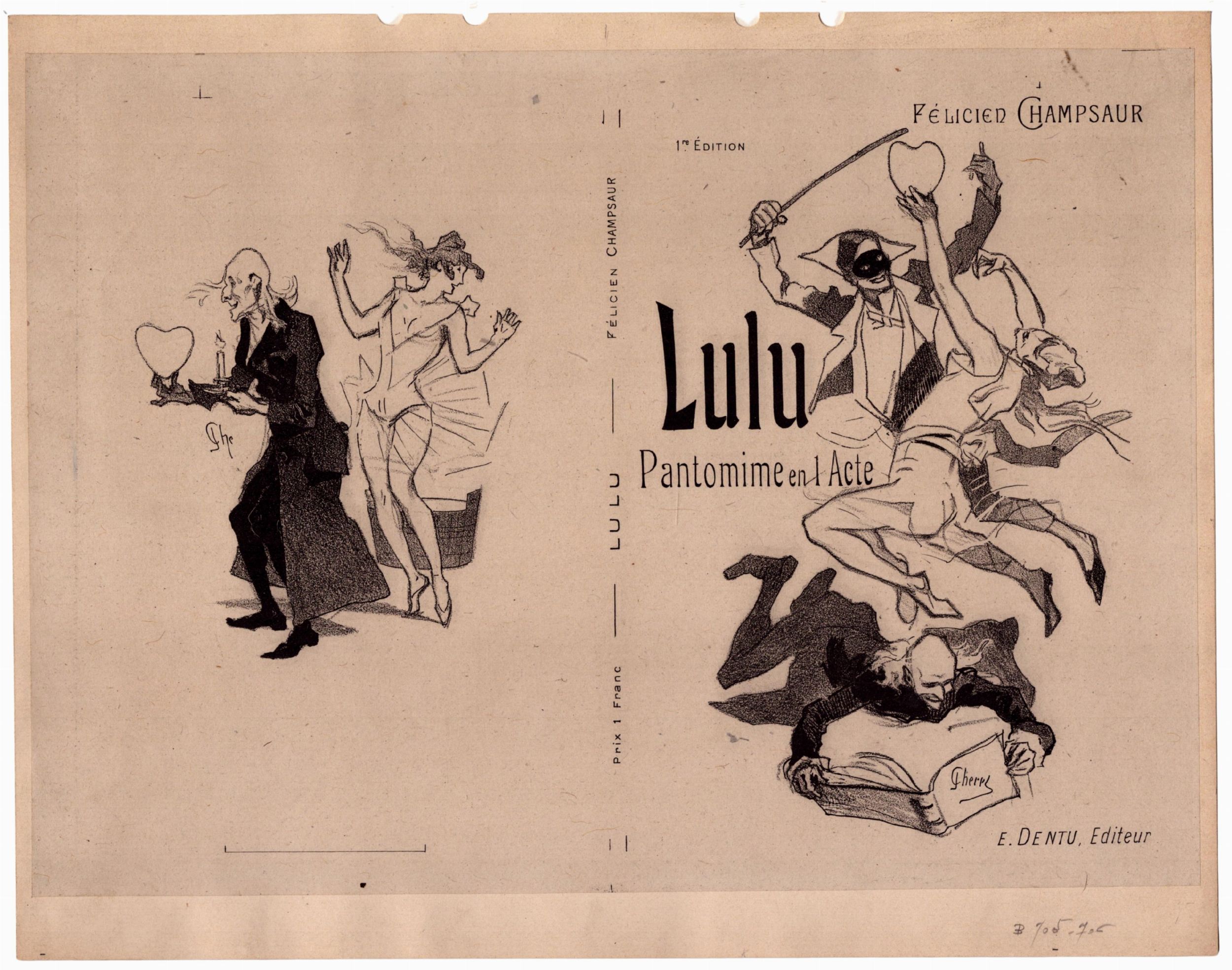 Litografia, 215 x 297 mm.  Prova di stampa in nero della copertina per 'Lulu. Pantomime en 1 Acte' di Félicien Champsaur. Esemplare controfondato, ma in ottimo stato di conservazione.