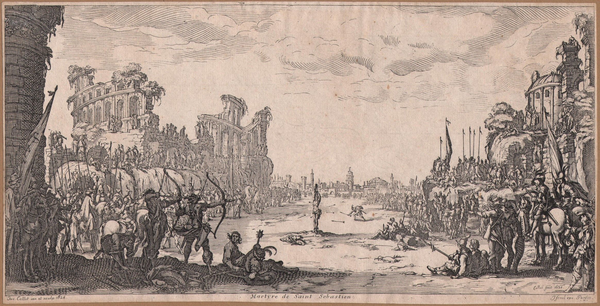 1630 ca. Copia coeva da Jacques Callot. Acquaforte, 165 x 324 mm. Lieure 670 copia 6 (databile a XIX). Bellissimo esemplare su sottile carta vergata con filigrana (Corno da Caccia in Arme coronata), databile al XVII secolo. Rifilato all'impronta della lastra. In ottimo stato di conservazione, salvo due tracce di vecchio incollaggio visibili al verso.