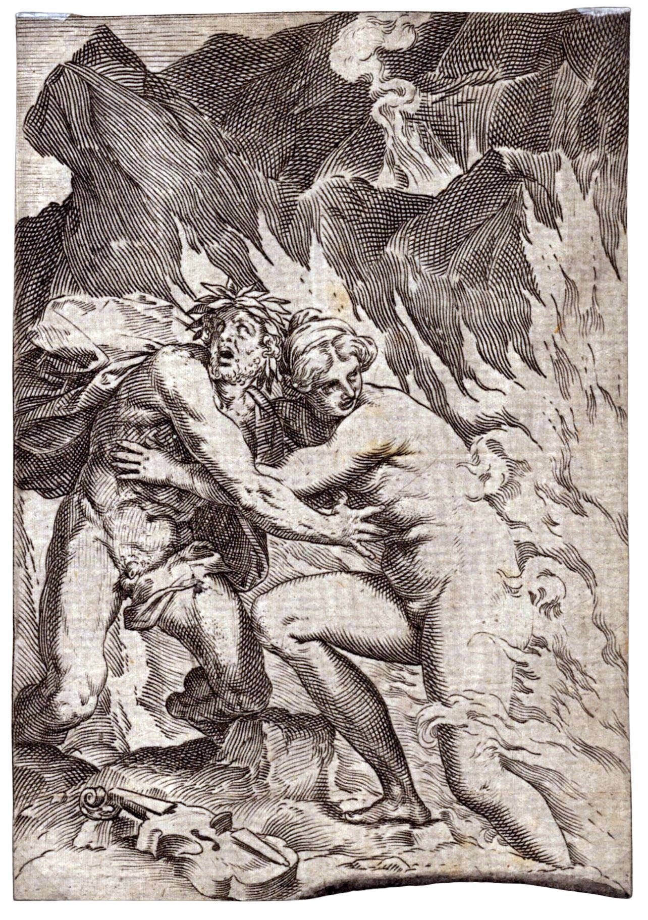Bulino, 149 x 103 mm (foglio). II stato su 2, con l'indirizzo di Donato Rasciotti. Bartsch XVIII.107.123, De Grazia 178. Impressione bella e nitida, stampata su carta vergata. Rifilata all'immagine. Presenta una macchia nera nella parte inferiore, che copre l'indirizzo di Rasciotti.