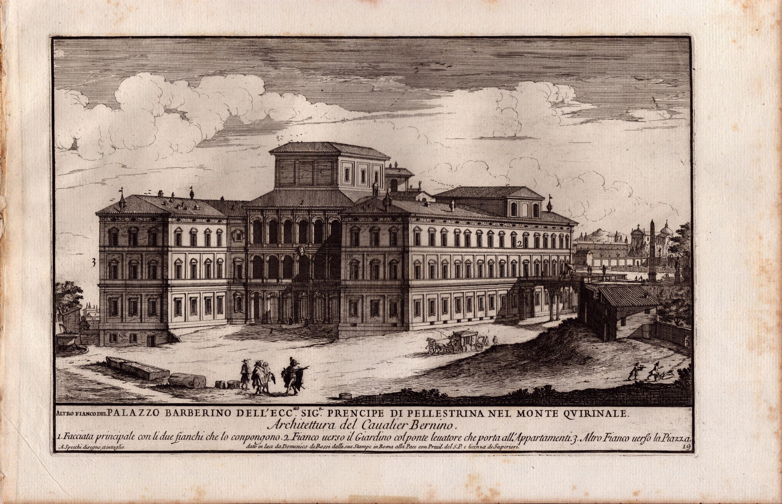 Lotto di cinque incisioni raffiguranti i palazzi di Roma. Acquaforte, 263 x 392 mm (cad. foglio) Belle impressioni su carta vergata (tre fogli con filigrana). Ciascun esemplare con margini preservati; due fogli con aggiunte di porzioni di carta vergata in alto e a sinistra. Fioriture sparse e alcune macchie, ma nel complesso in buono stato di conservazione.