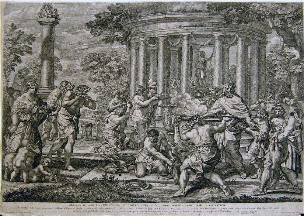 Acquaforte, 445 x 630 mm. LeBlanc I.53.62. Bell'esemplare stampato su carta vergata. Rifilato all'impronta della lastra, con traccia della consueta piega centrale. Foglio uniformemente brunito, con restauri visibili al verso.