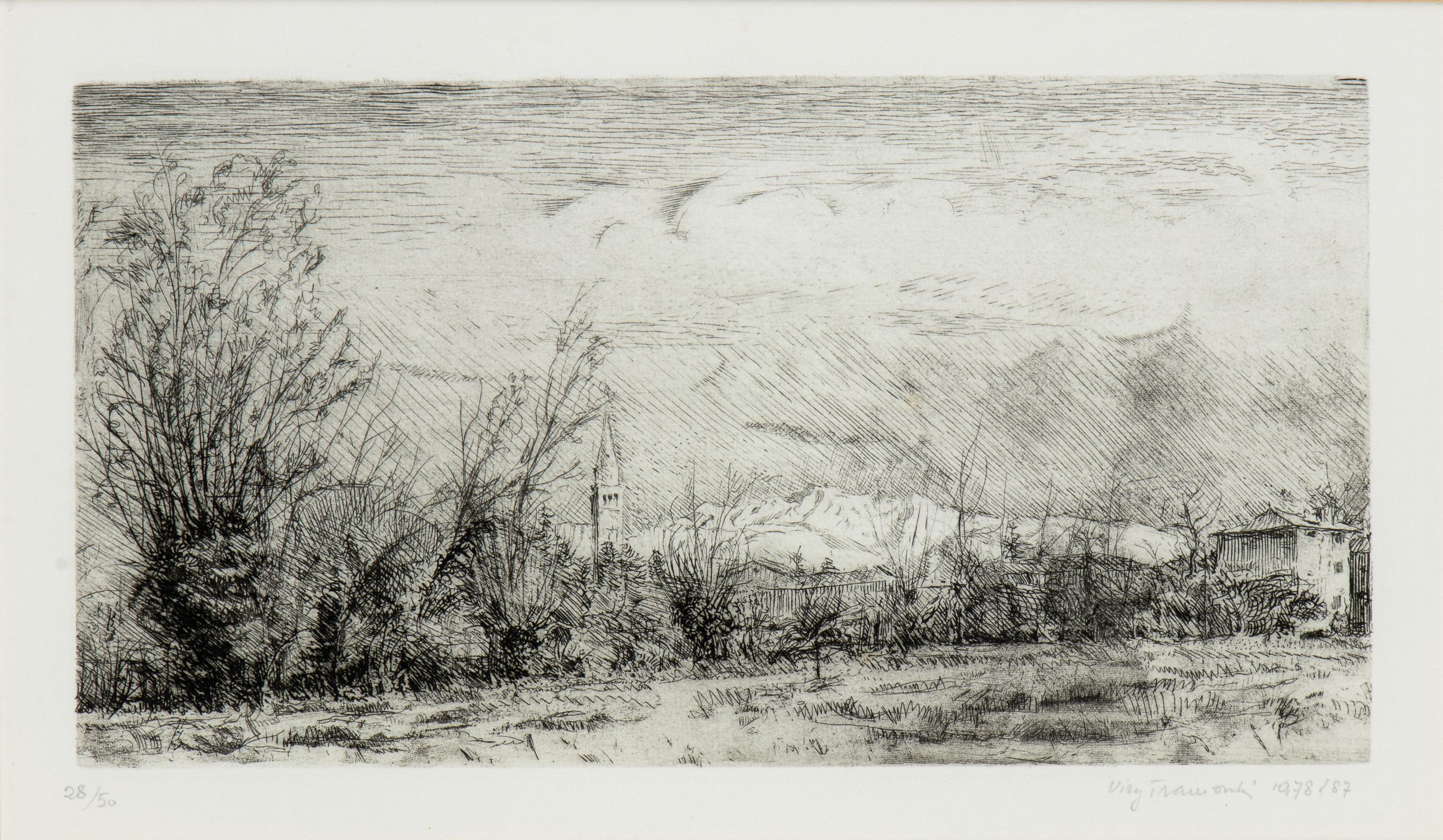 1978 Acquaforte, 135 x 267 mm (lastra). Tiratura 28/50, firmata a matita in basso. Molto bella, fresca impressione. Con passe-partout e cornice (55 x 45 x 3 cm).